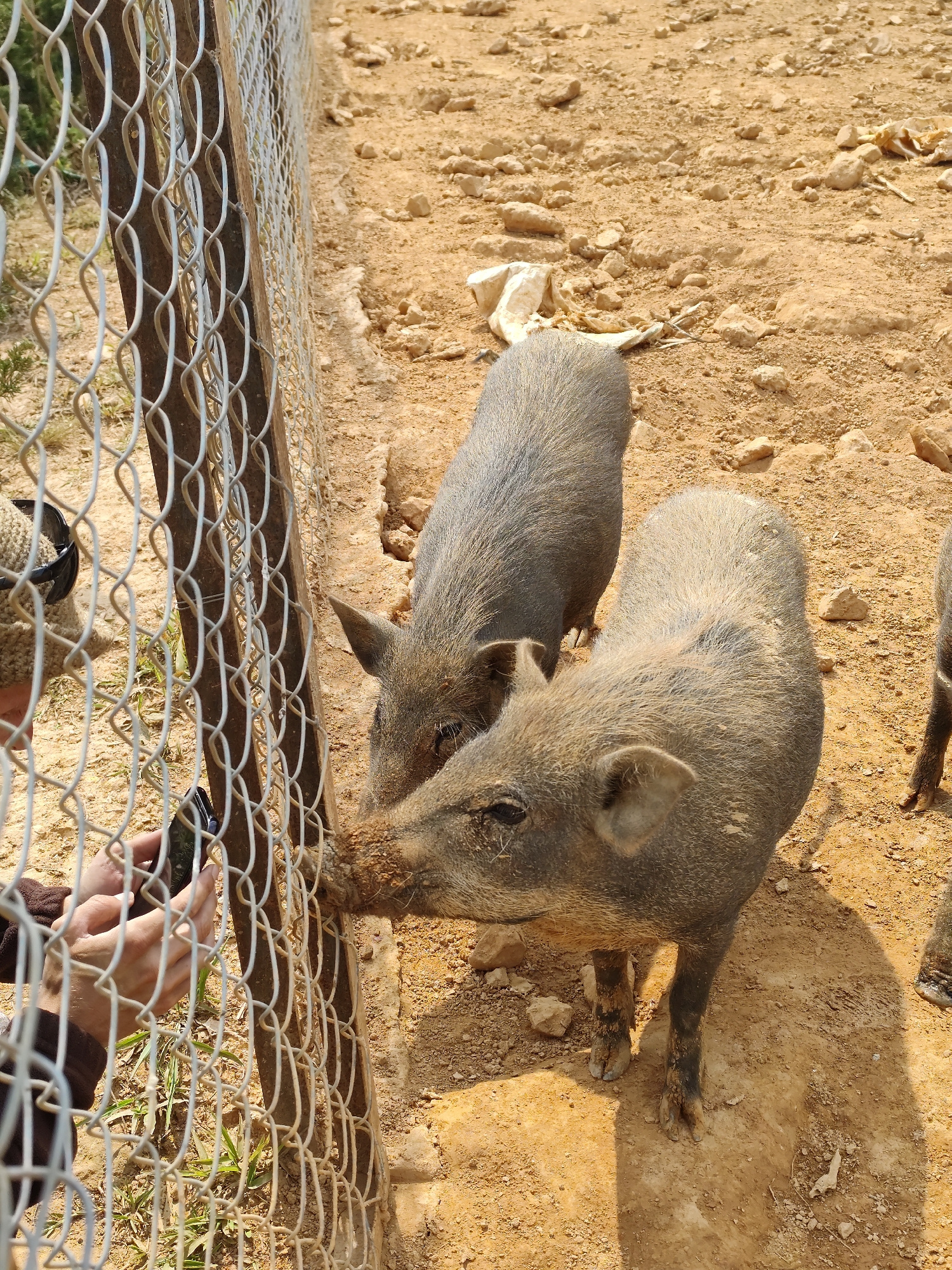 A medium-angle shot depicts three wild boars in an enclosure at a location potentially within Lạc Dương, Vietnam. One boar is actively interacting with a person just beyond the fence. The person, whos…read more