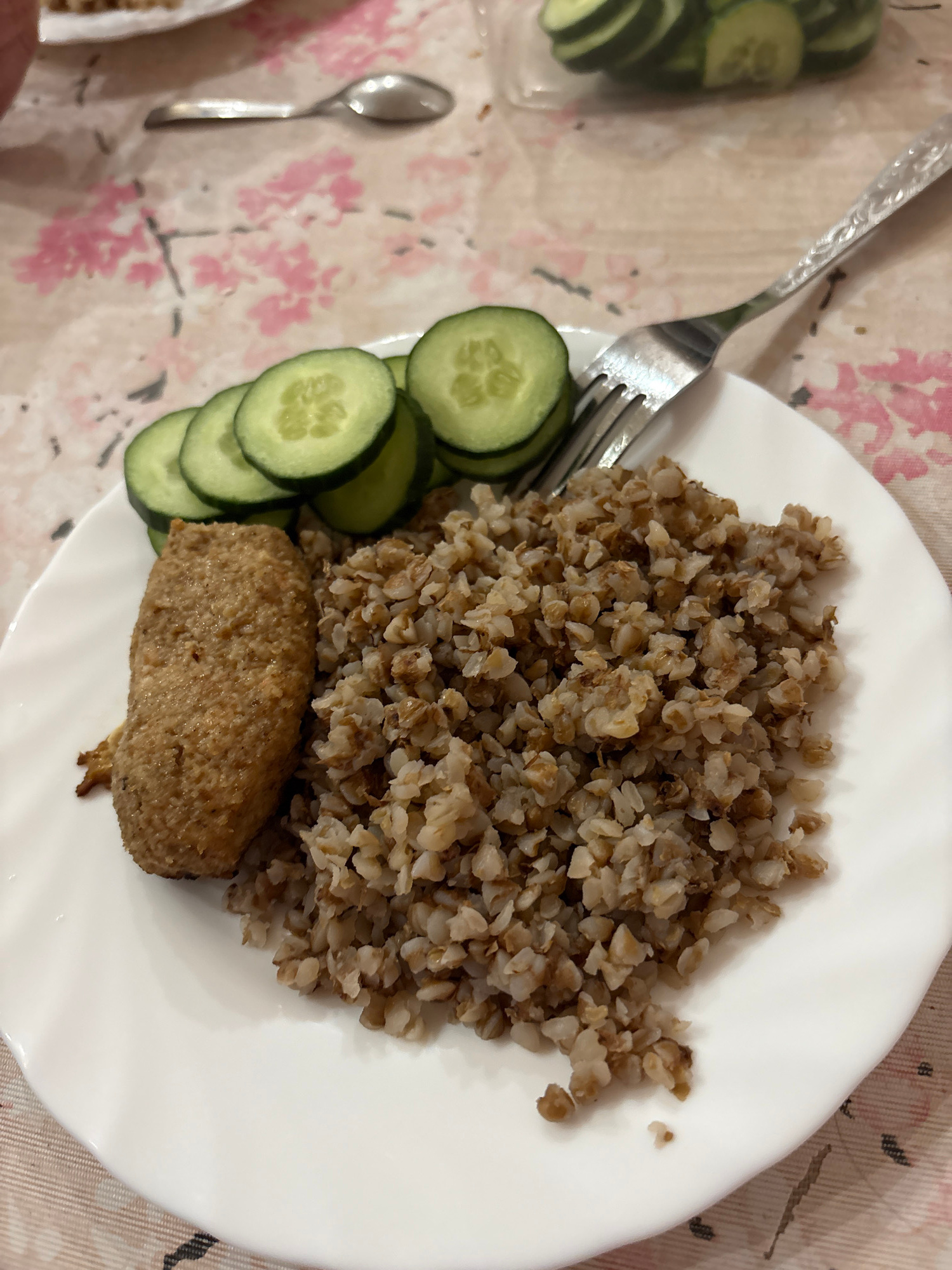 The image depicts a plate of food consisting of buckwheat, sliced cucumbers, and a meat patty, arranged on a white plate. A fork rests on the left side of the plate, near the cucumbers, with a spoon v…read more
