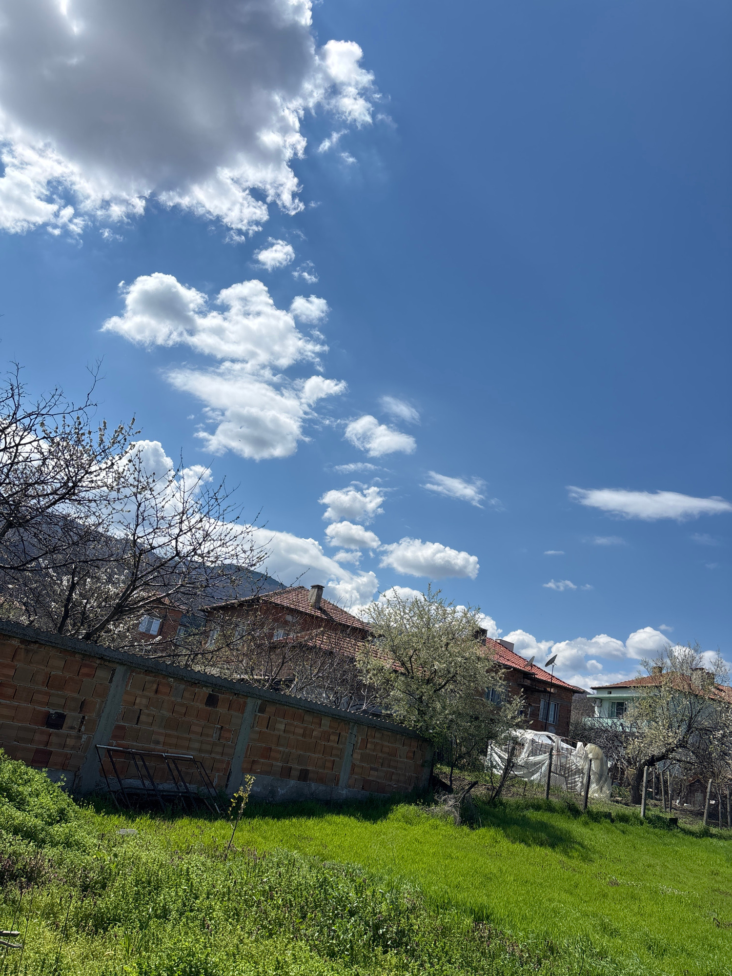 The image depicts a residential area in Kuklen, Bulgaria, under a partly cloudy blue sky. Buildings with red-tiled roofs and brick walls are visible amidst green grass and trees. Some trees are blosso…read more