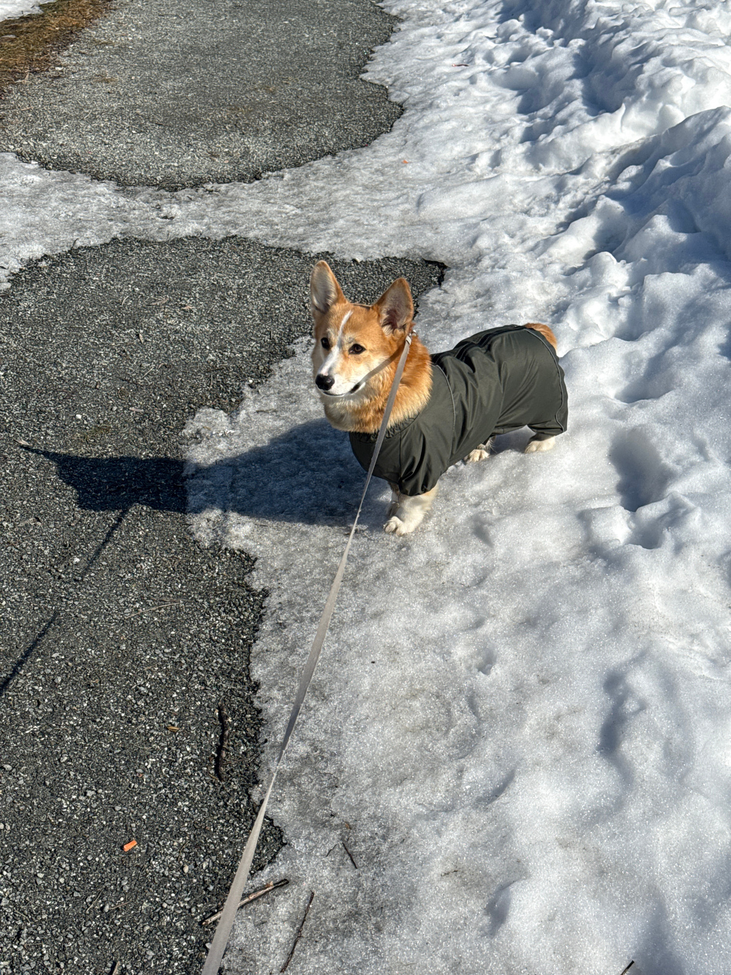 A medium-shot shows a Corgi wearing a green jacket on a leash, standing on an asphalt surface next to a patch of melting snow. The dog is looking up at the camera. The asphalt is dark gray and has sma…read more