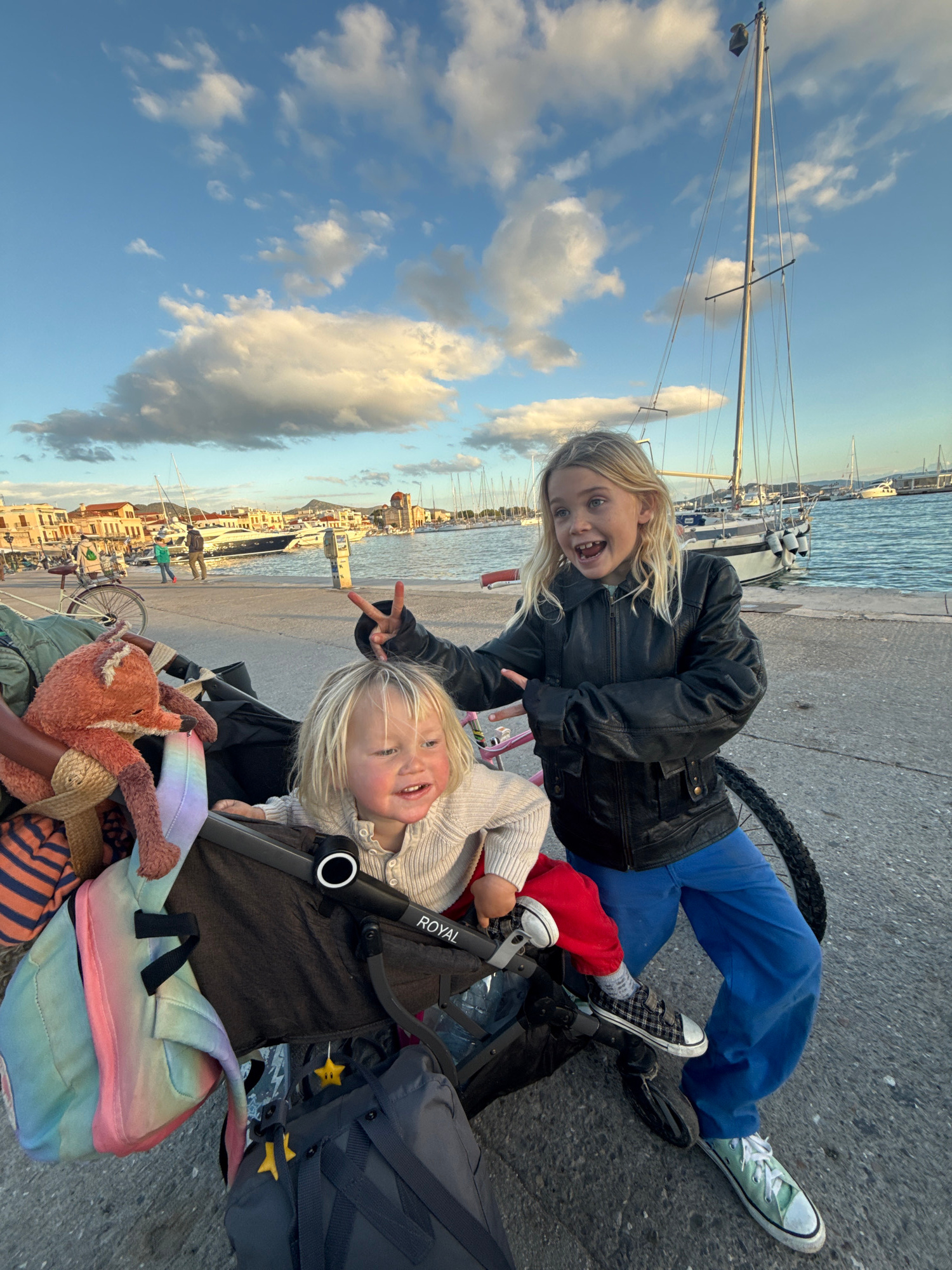 Two blonde children are featured in the foreground of a paved quay at the harbor of Aegina, Greece. An older child, approximately 8-10 years old, stands to the right of a dark-colored stroller, wearin…read more