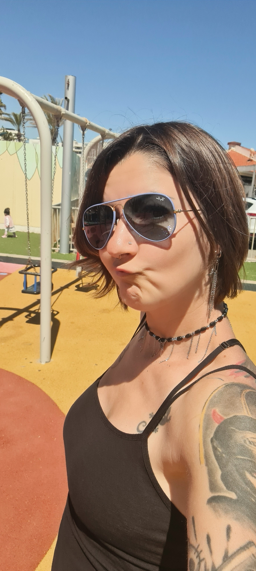 A woman with brown hair and tattoos is the primary subject. She is wearing sunglasses, a black tank top, and a necklace. She has piercings in her nose and ear. The location is a playground in Nahariyy…read more