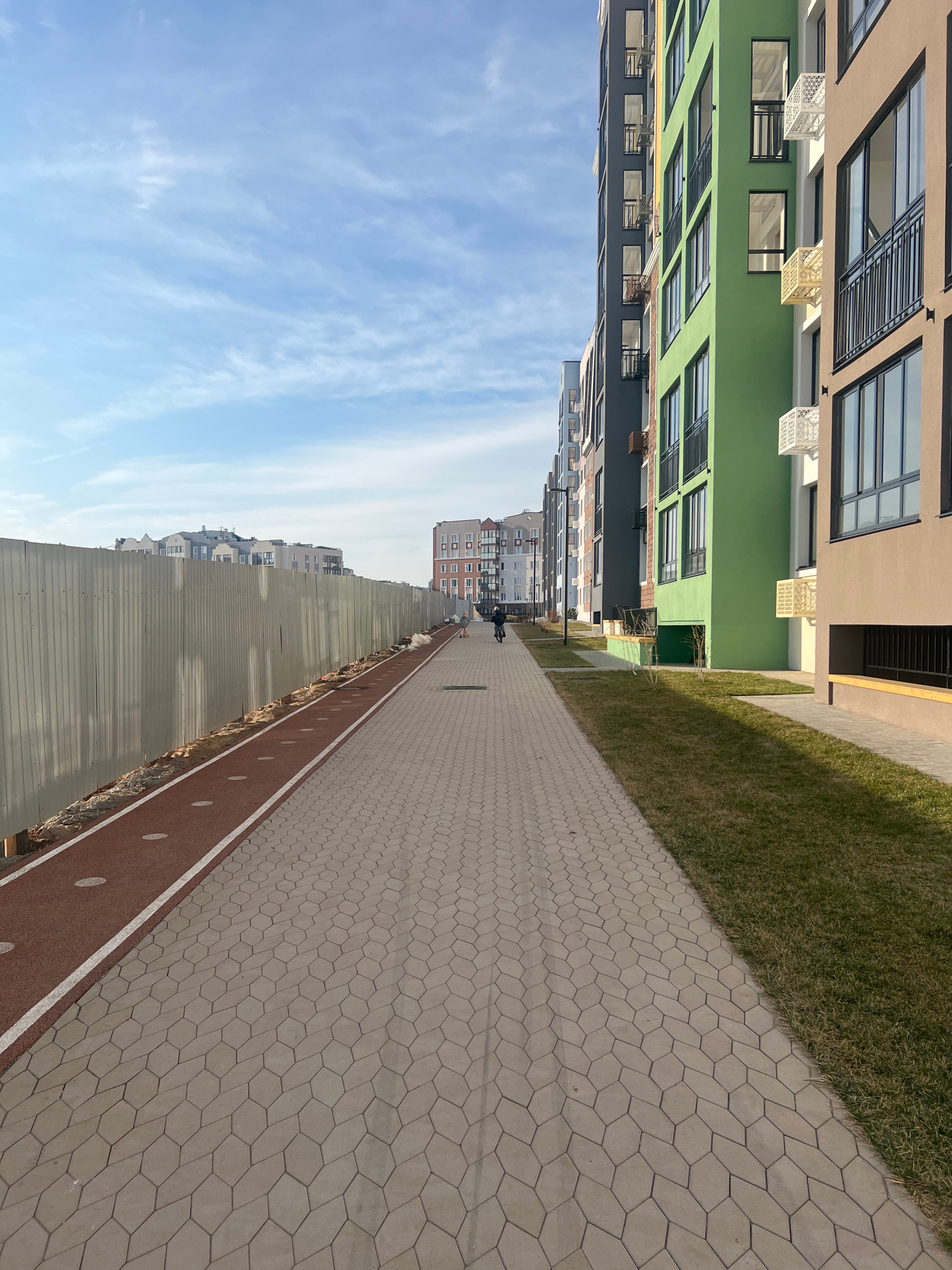 The image depicts a street scene in Pervomaysky, Russia. Buildings of varying heights and colors line one side of the street. A paved walkway with a running track runs along the buildings. Beyond the…read more