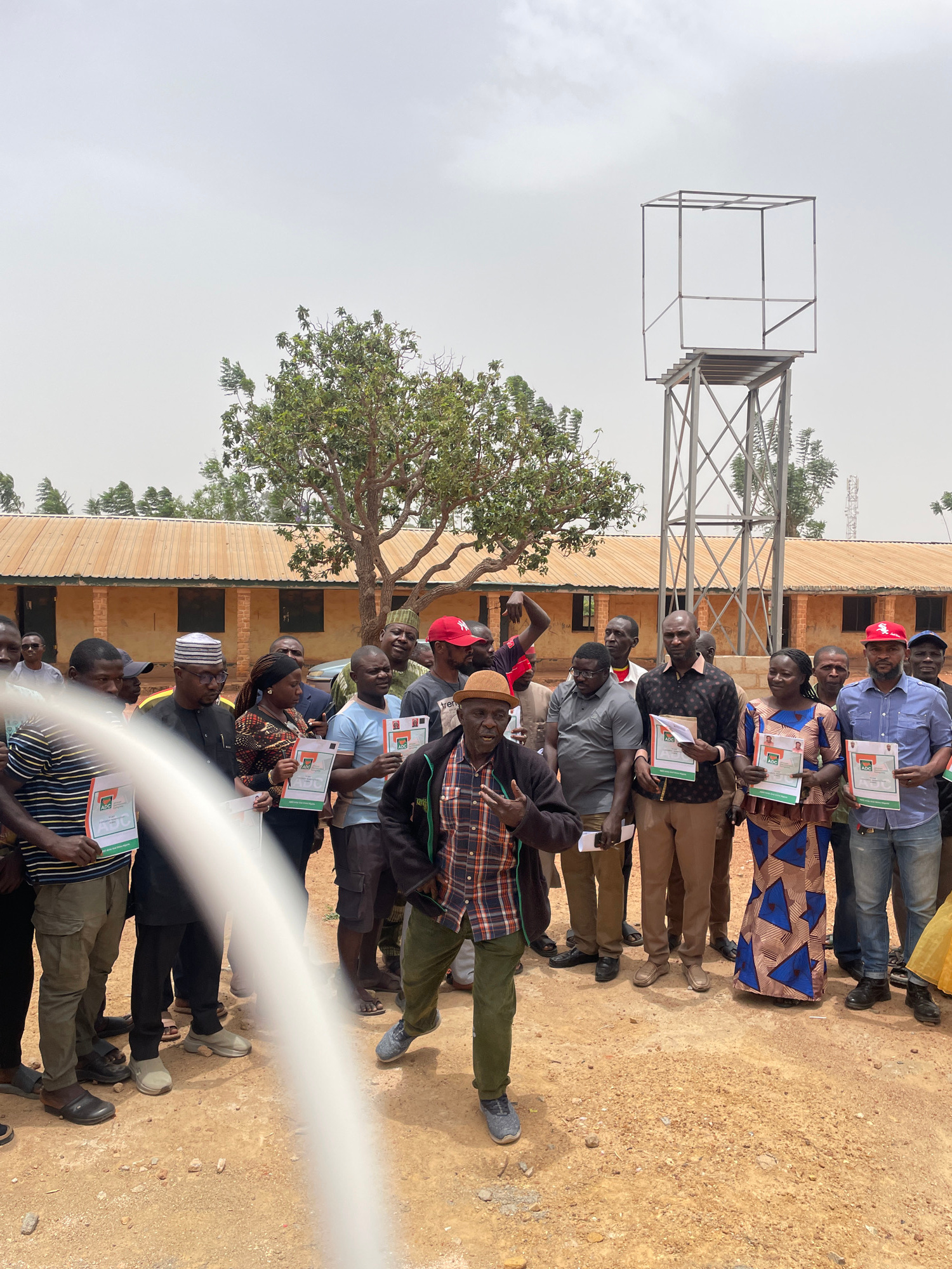 A group of approximately 20 individuals stand in a row outdoors on a sandy, dirt ground. Each person holds a document, possibly a certificate, with green and red colors visible on it. The people are d…read more