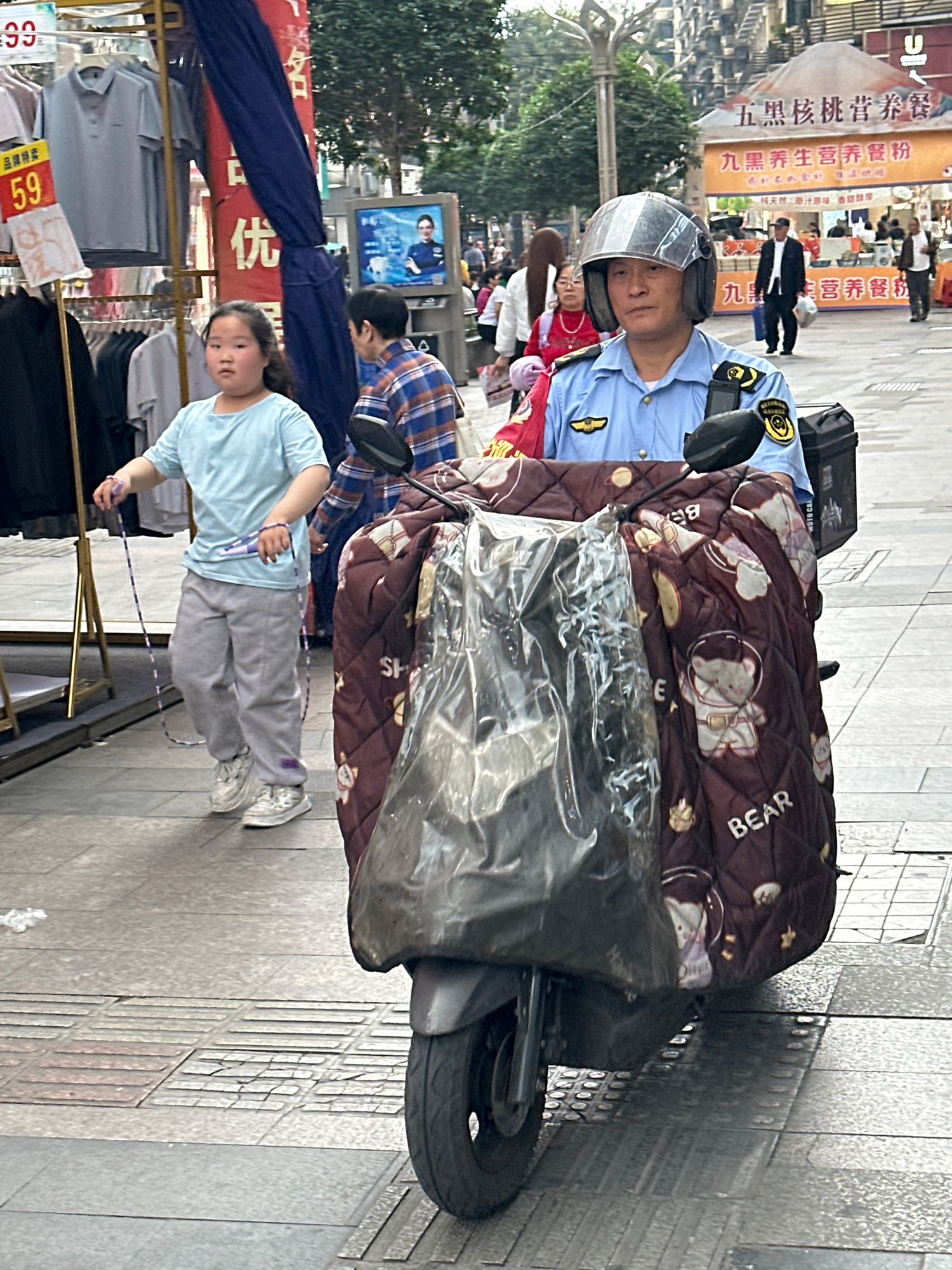 The image captures a street scene in what appears to be Jiangjin, China. A man in a police uniform, wearing a clear helmet, sits on a scooter that is partially covered with a patterned blanket featuri…read more