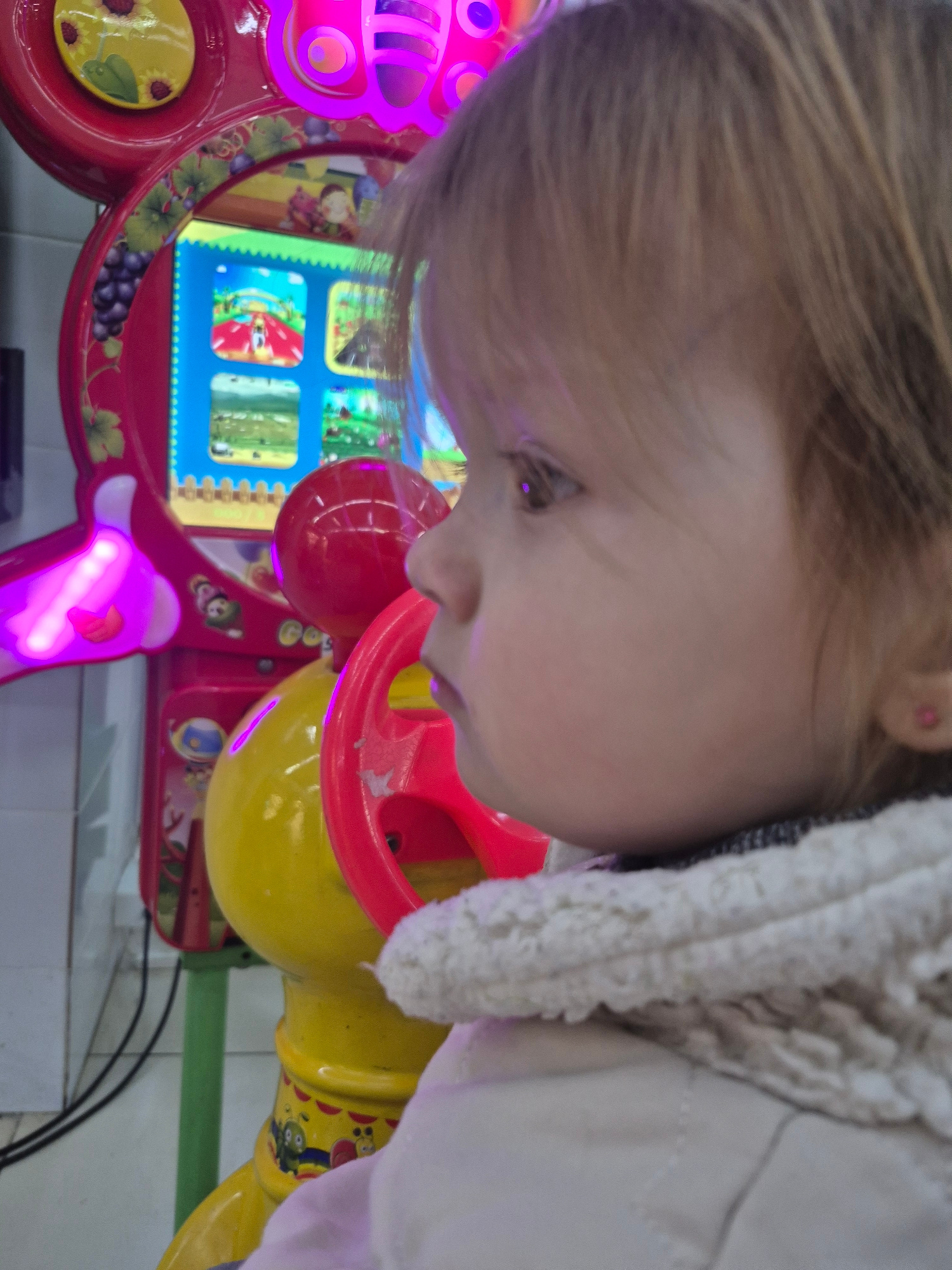A toddler with blonde hair is looking at a brightly colored, interactive toy or game. The toy has a screen with various images displayed, and it features components in red, yellow, and pink with decor…read more