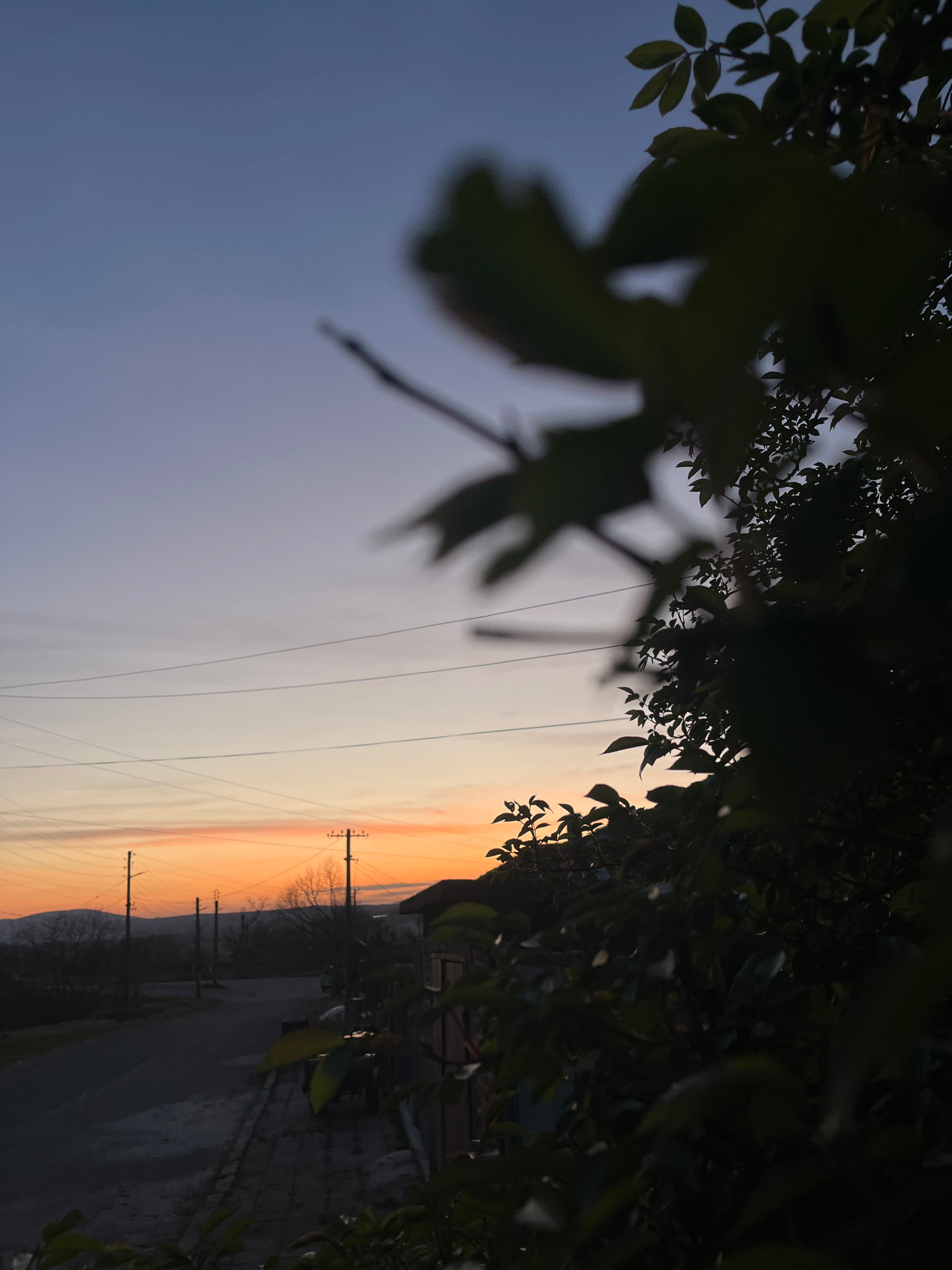 The image shows a dusk or dawn scene in what is likely Lozarevo, Bulgaria, judging from the user's request. The view is partially obscured by foliage in the foreground. In the middle distance, there a…read more