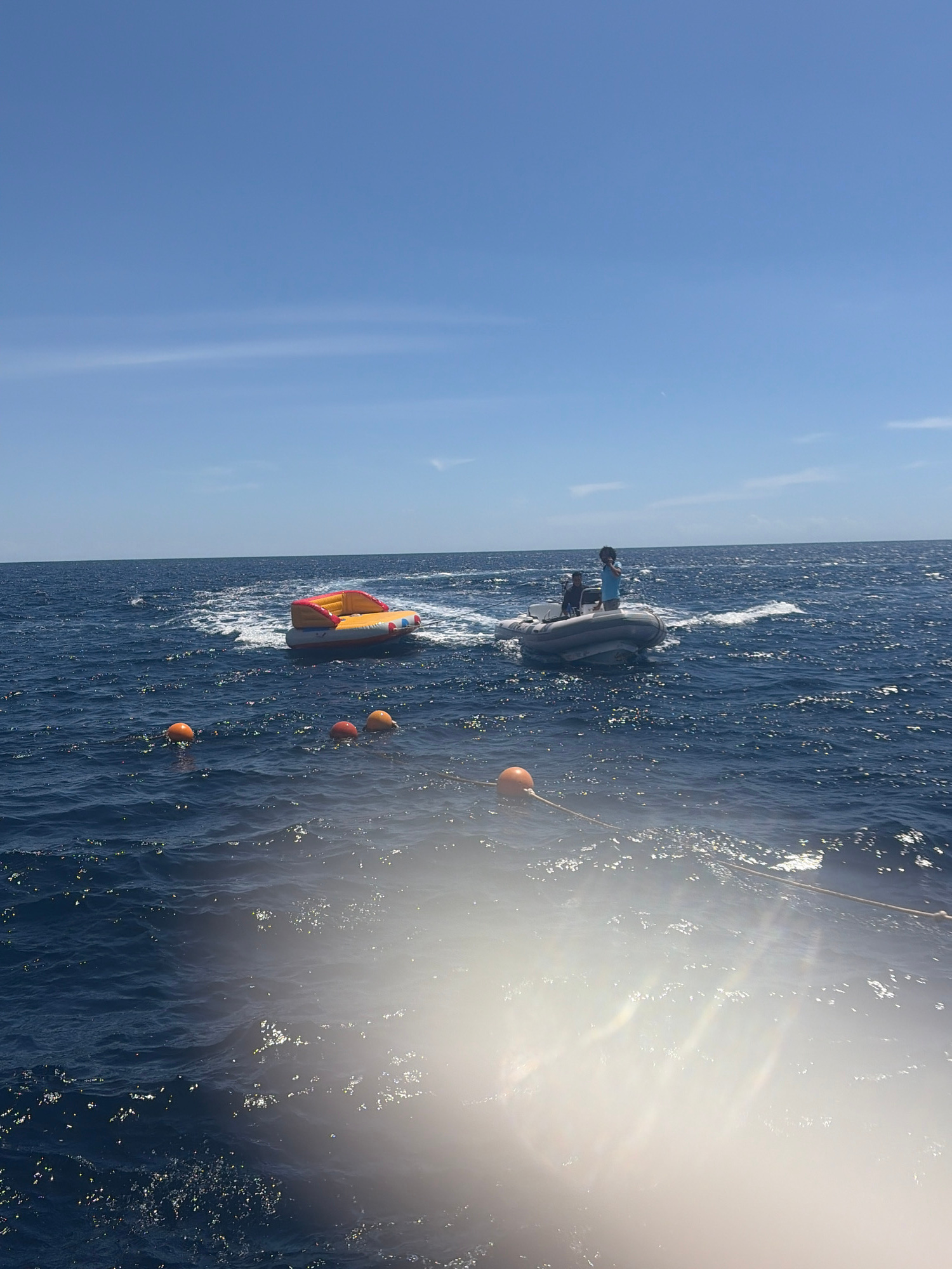 The image captures a daytime open water scene off the coast of Sharm El Sheikh, Egypt. A clear blue sky with minimal wispy clouds dominates the upper portion of the frame. The deep blue sea is choppy,…read more