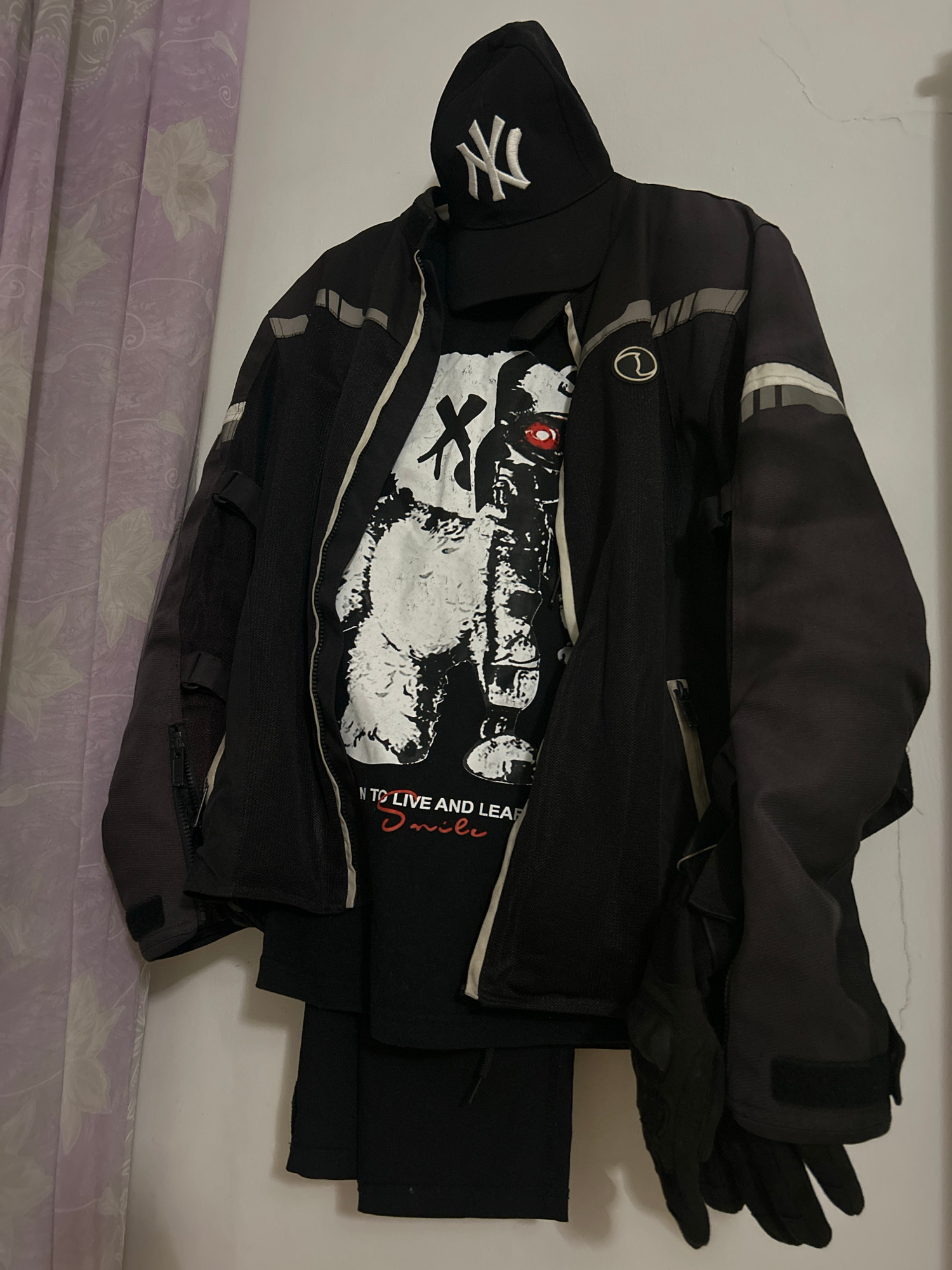 The image depicts a black motorcycle jacket with reflective stripes, a black t-shirt with a white graphic design, a black baseball cap with the New York Yankees logo, and black gloves. These items are…read more