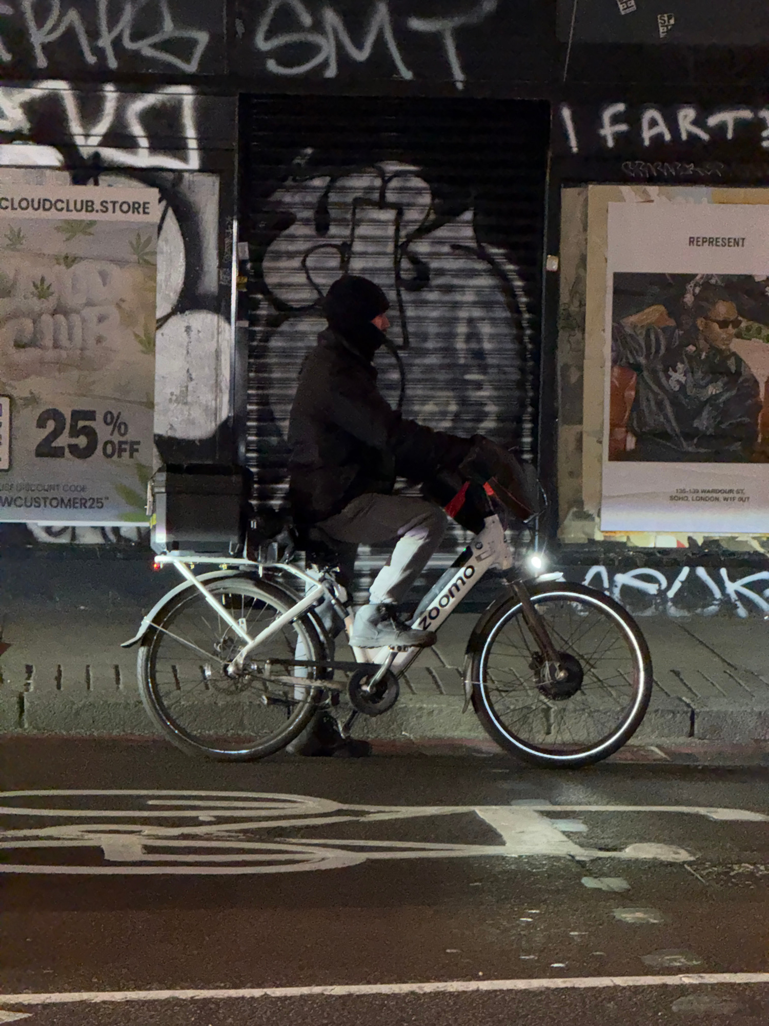 A person stands next to a white "Zoomo" bicycle on a city street in London, United Kingdom. The person is wearing a black jacket, grey pants, and a black hat. Graffiti adorns the surrounding walls, in…read more