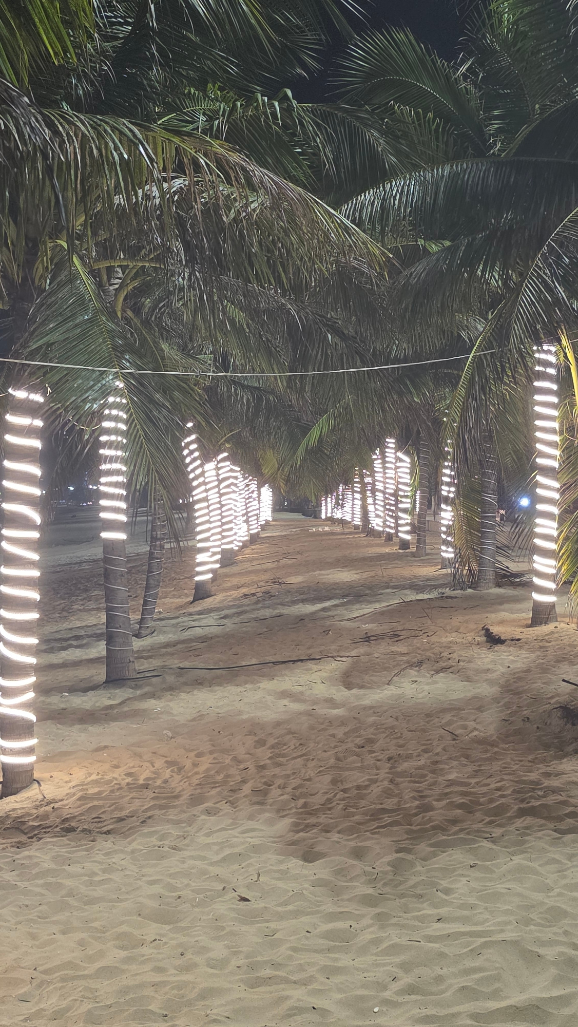 At night, a line of illuminated palm trees borders a sandy beach in Nha Trang, Vietnam. The tree trunks are wrapped with glowing lights, and the trees' shadows are cast on the sand. The beach stretche…read more