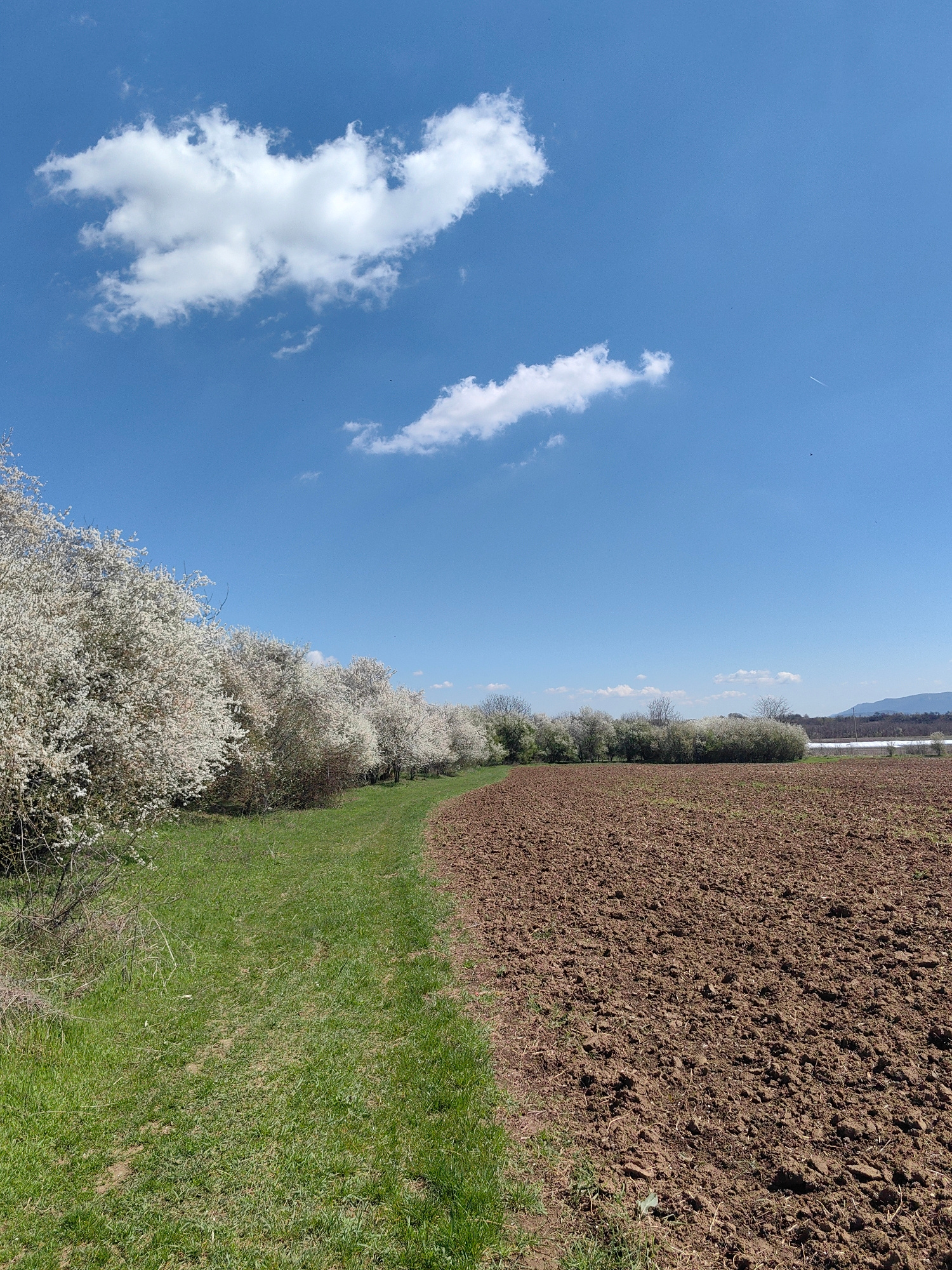 The image depicts a rural scene in Shumata, Bulgaria. A field of freshly plowed brown earth occupies the right side of the frame. Along the left edge of the field is a strip of green grass, bordered by a row of flowering trees with white blossoms. The sky is blue with scattered white clouds. In the distance, a faint mountain range is visible. There are no people visible in the scene. | Open Wire