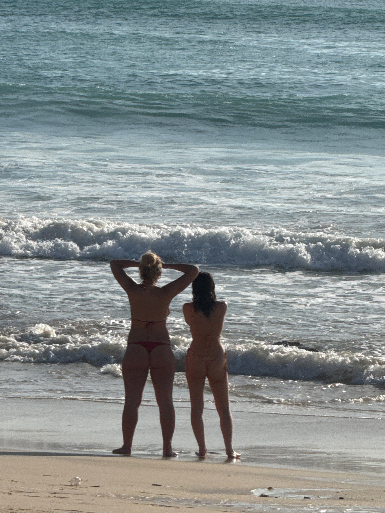 This image captures a bright, sunny beach scene in Kuta Selatan, Indonesia, featuring two individuals standing at the water's edge. The photograph is oriented vertically, but depicts a landscape view…read more