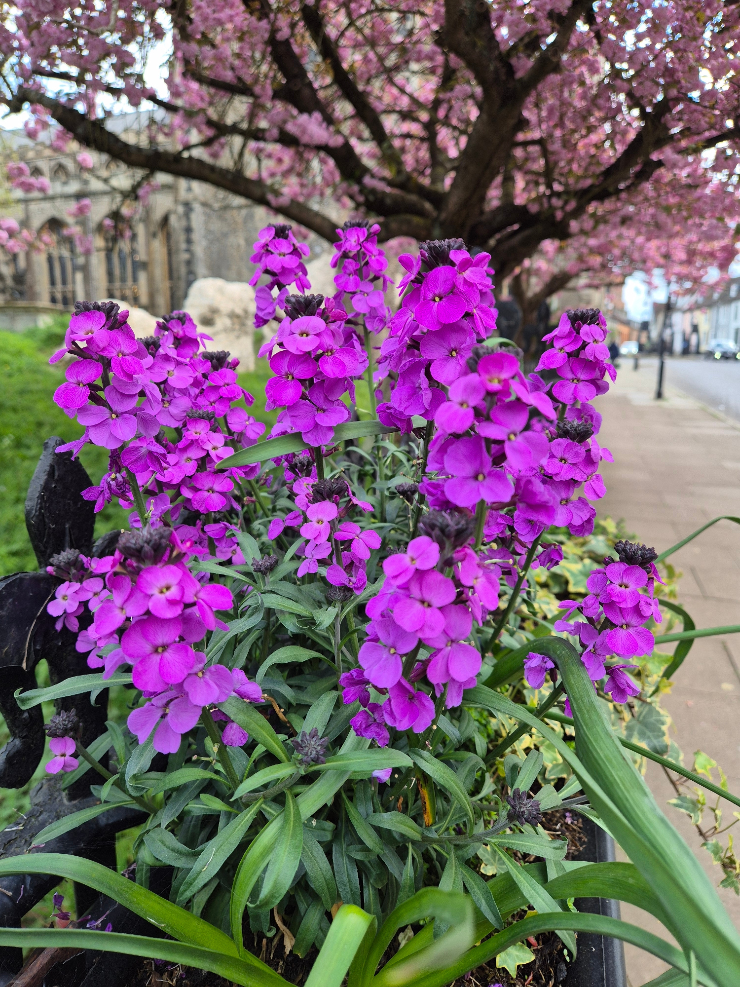 The image captures a close-up of vibrant purple flowers, likely blooming in a flowerbed or container. The flowers feature four petals each, characteristic of the Brassicaceae family. Amid the purple b…read more
