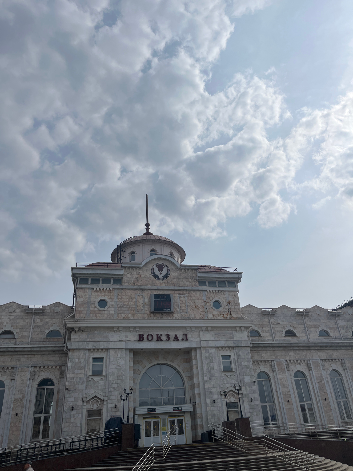 The image shows the Izhevsk railway station in Russia, viewed from a low angle, making it appear tall. The building is made of light-colored stone, with architectural details such as arched windows, s…read more
