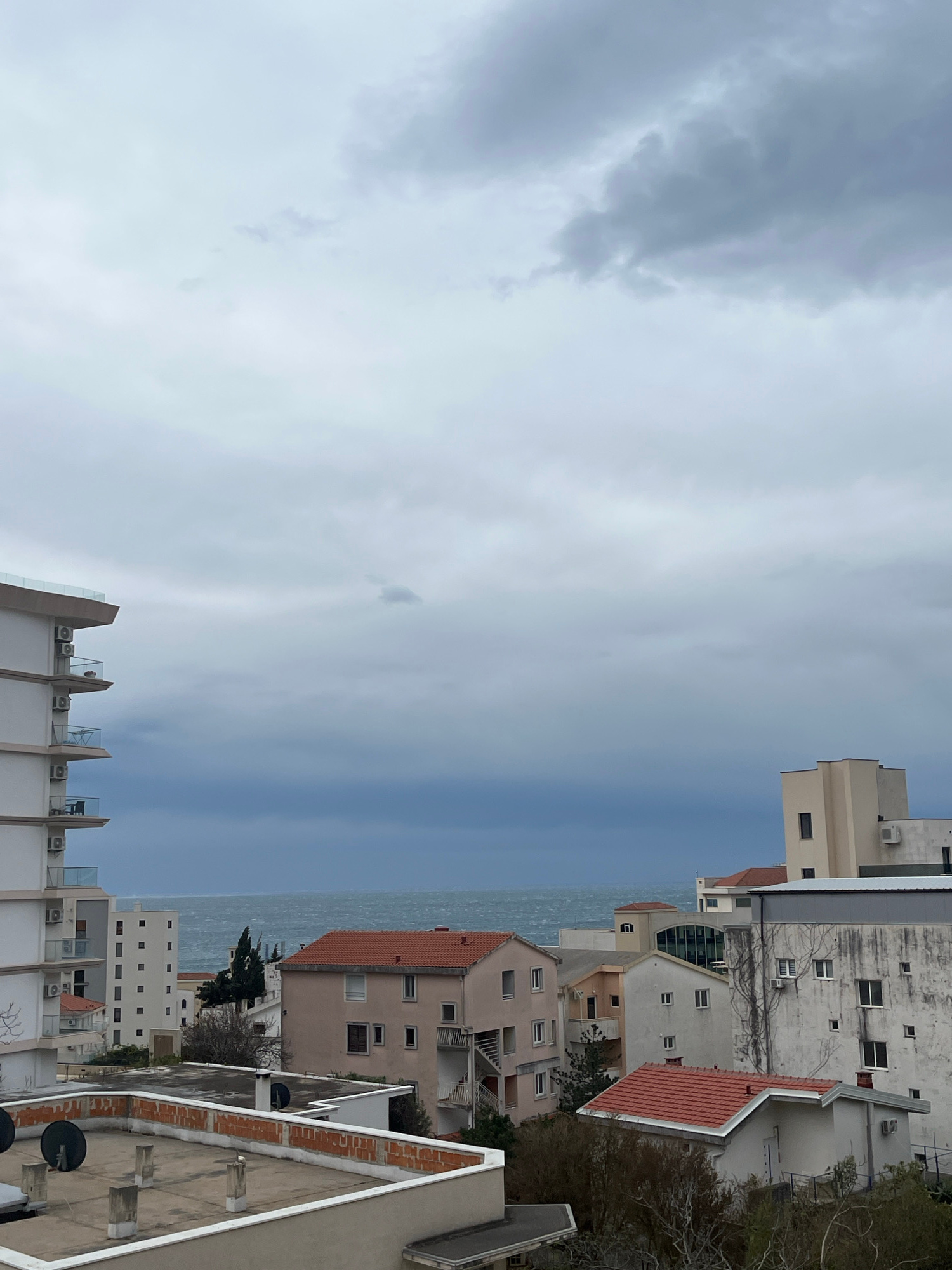 The image shows a view over buildings towards the sea in Boreti, Montenegro. The sky is overcast with heavy grey clouds. The sea appears calm, with a band of blue-grey water visible between the buildi…read more