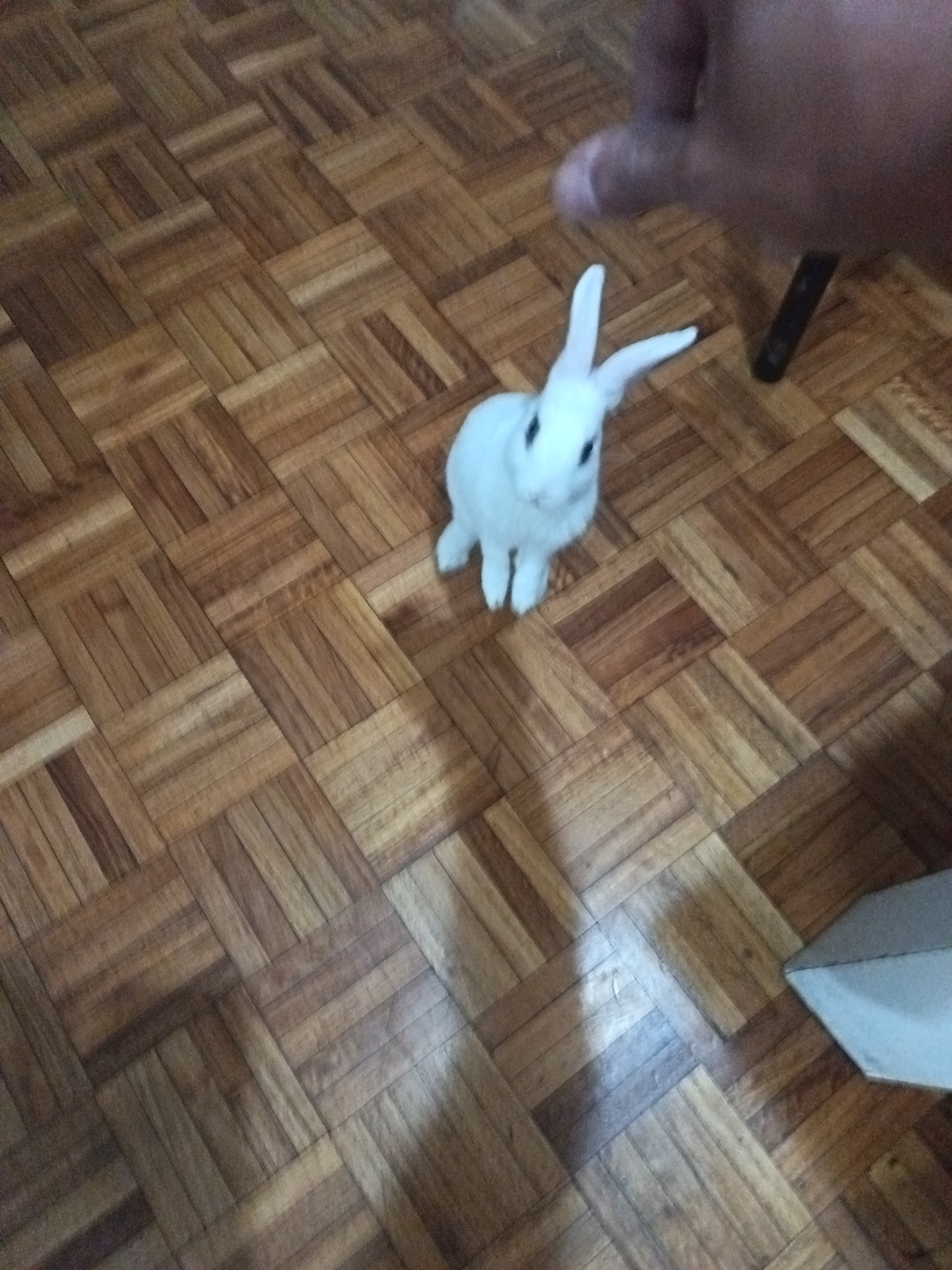 A small, white rabbit stands on a wooden parquet floor. A human hand is visible in the upper right corner of the frame. A black object, possibly a furniture leg, is near the hand. A cardboard box is i…read more