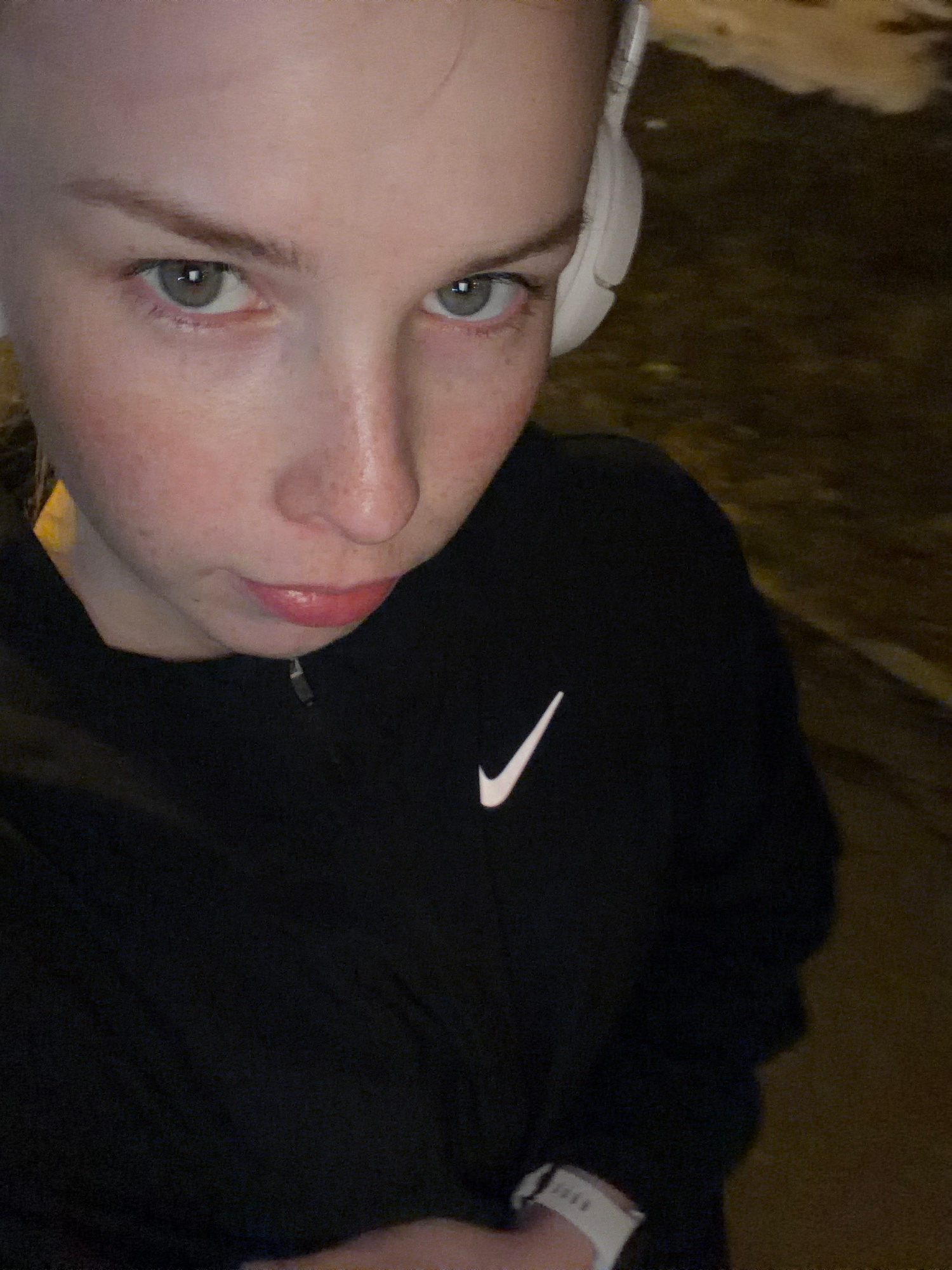 A close-up, slightly distorted, low-angle portrait shows a young person with light skin and light green eyes. The person is wearing white headphones and a black jacket with a white Nike swoosh logo on…read more