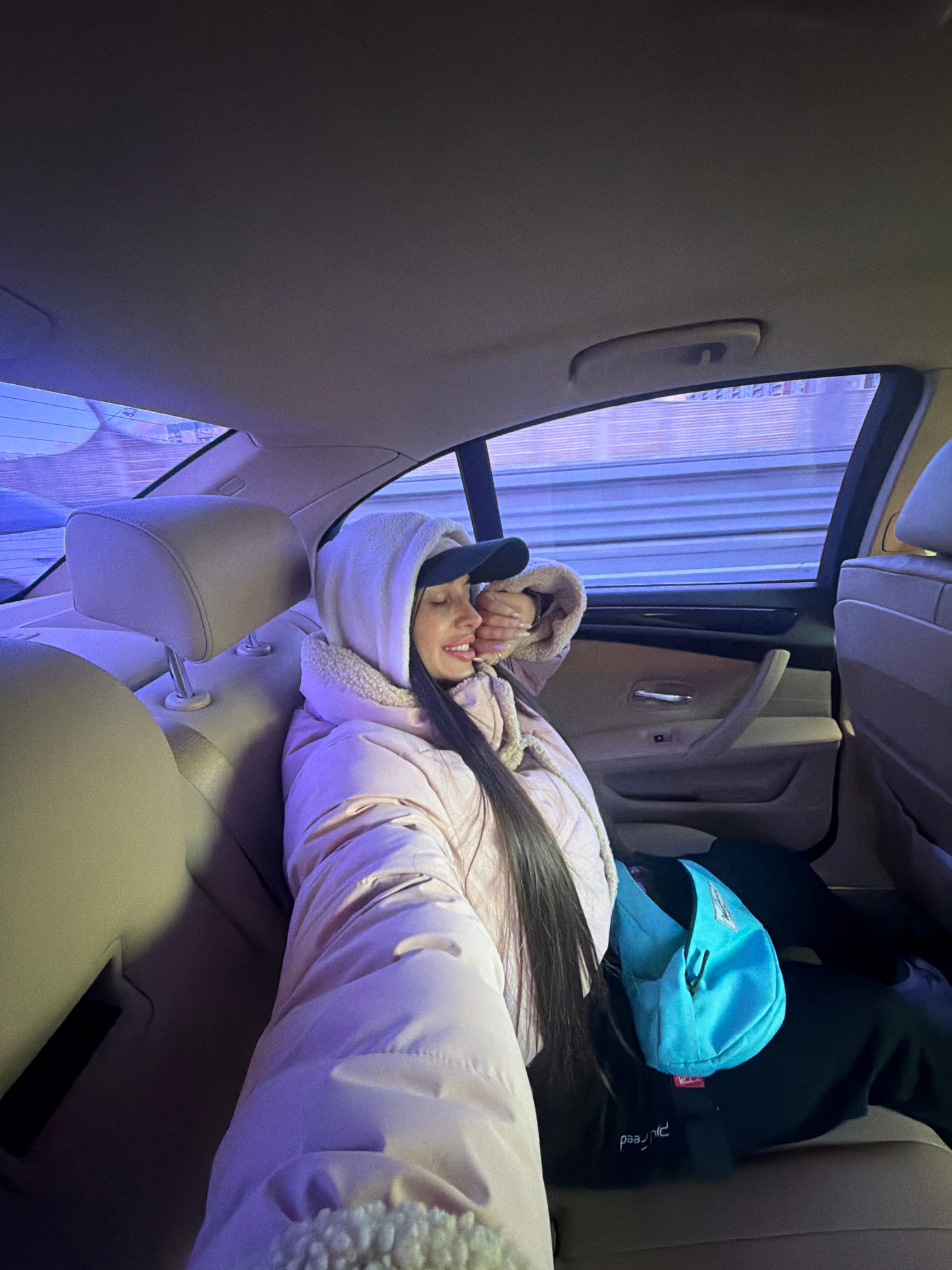 A young woman is lying in the back seat of a car. She is wearing a light pink puffy jacket with a sherpa-lined hood, black pants, and a black baseball cap. A light blue backpack lies beside her on theβ¦read more