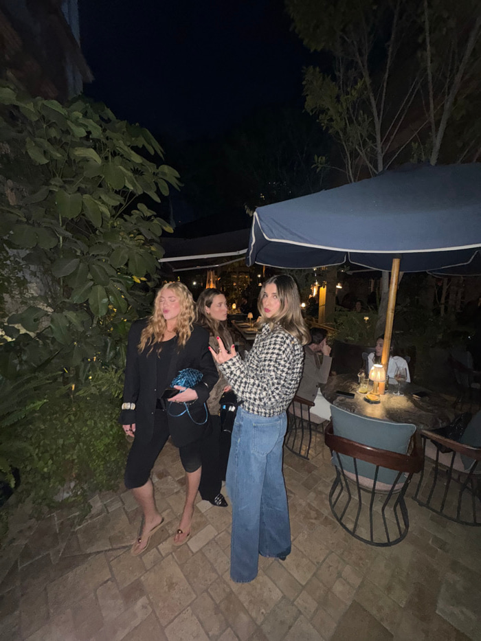 Three young women are laying on a stone patio under a large blue umbrella at night. The woman on top wears a black and white houndstooth jacket and jeans. The woman in the middle wears all black, andβ¦read more
