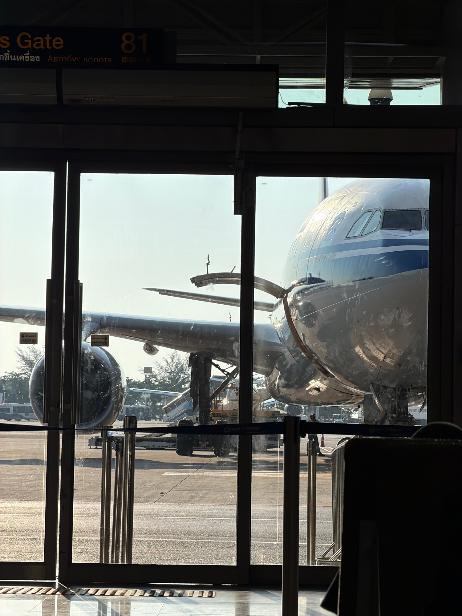 The image depicts an airport scene from inside a terminal building at what is identified as Phuket International Airport (HKT) in Mai Khao, Thailand. The view is through large glass doors, partially f…read more