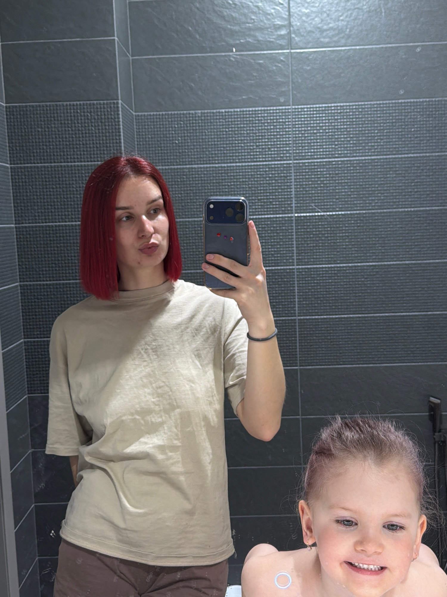A person with red hair is taking a selfie with a child in a bathroom with gray tiled walls. The person is wearing a beige shirt and brown pants. The child is smiling. The location cannot be determined…read more