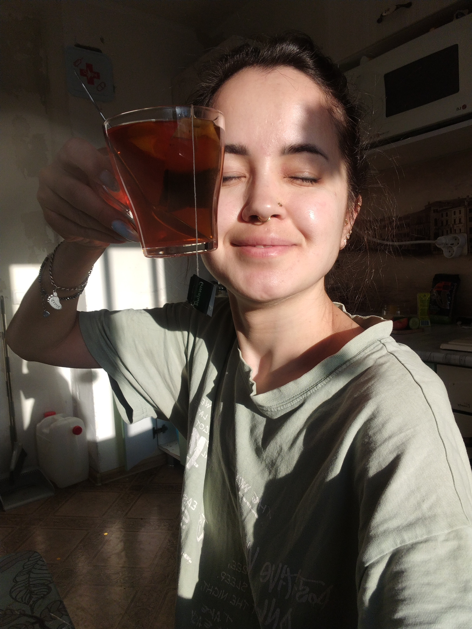 A young woman is depicted indoors, holding a clear glass mug of tea in bright, warm sunlight. She has dark hair, dark eyebrows, and her eyes are closed in a relaxed, smiling expression, conveying cont…read more