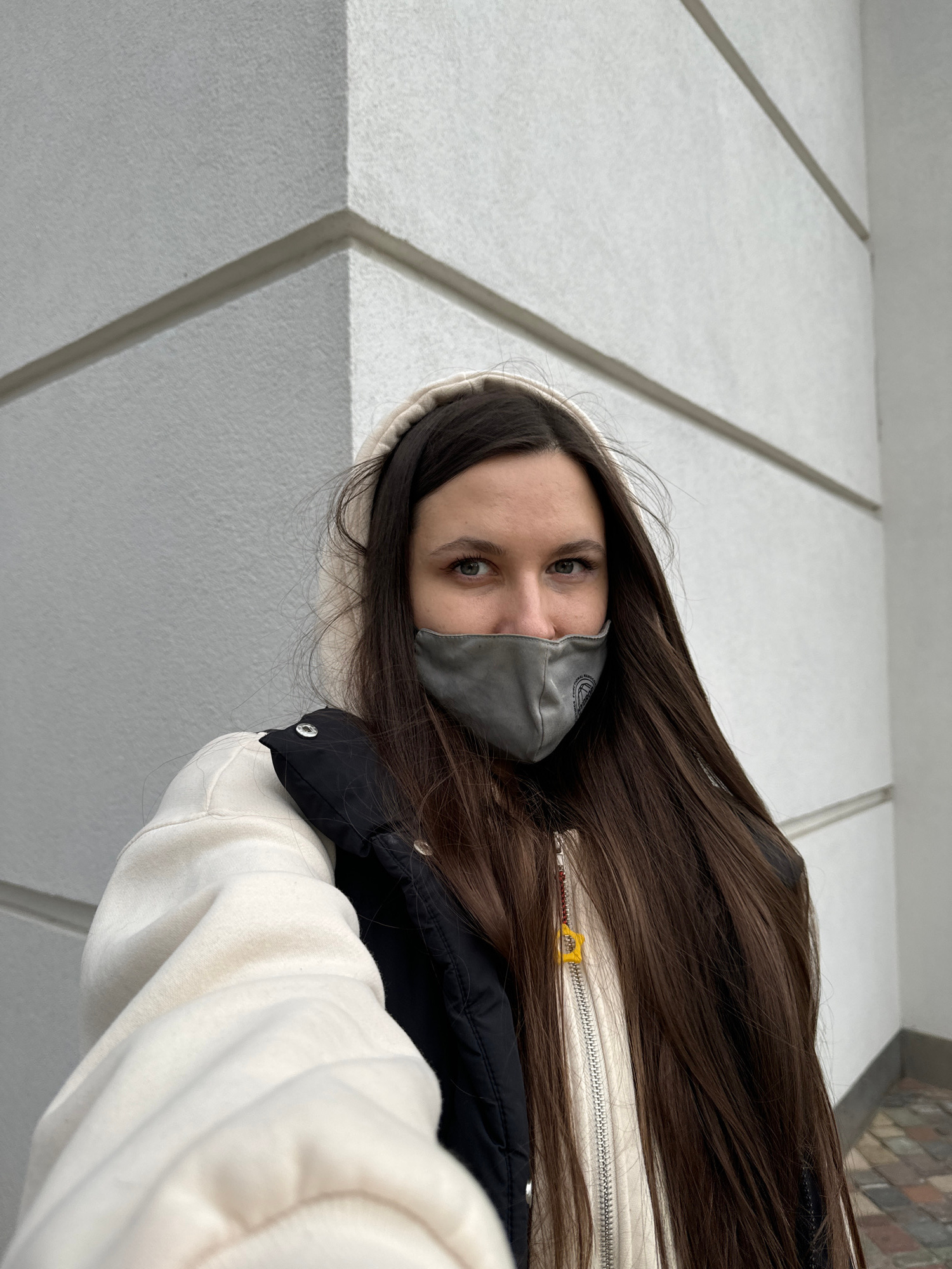 A young woman with long, dark brown hair is captured in a close-up, angled portrait, looking directly at the camera. She wears a light-colored, possibly off-white or cream, hooded sweatshirt, layered…read more