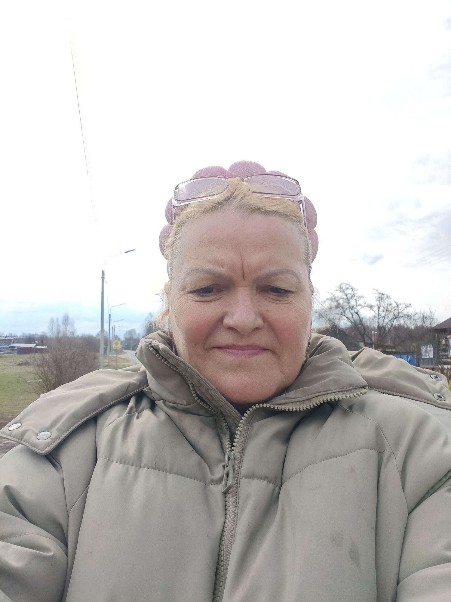 A close-up outdoor selfie depicts a middle-aged to older woman, likely in Krasny Mayak, Russia. She is shown from the chest up, filling most of the frame. Her blonde hair is pulled back, and a pair of…read more