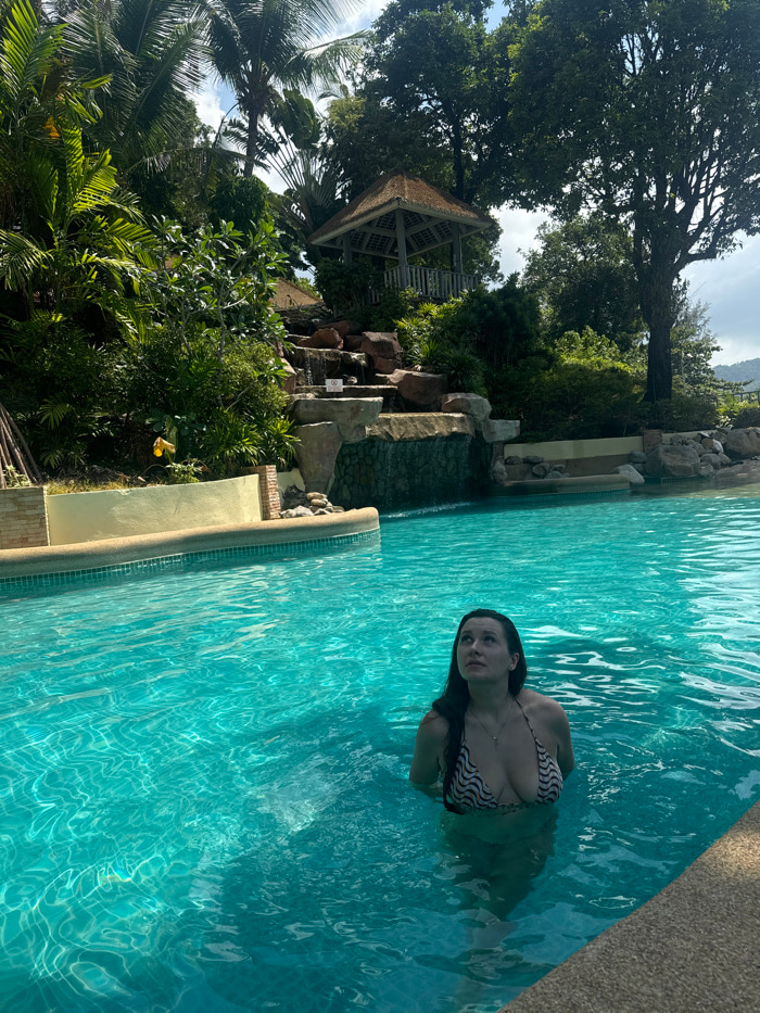 A woman in a patterned bikini stands in a pool. Turquoise water ripples around her. Behind her, lush green vegetation and tall trees surround a gazebo with a brown roof. A stone waterfall cascades dow…read more
