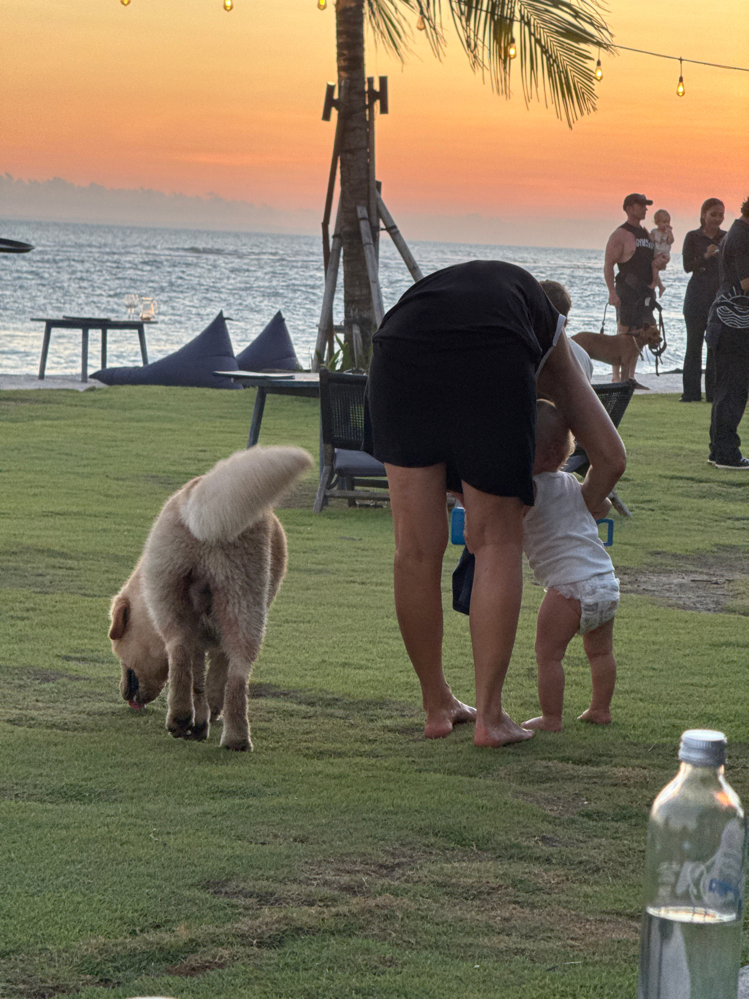 An outdoor scene captured during sunset depicts a relaxed gathering by a body of water in Mengwi, Indonesia. The image is dominated by a vibrant sky, transitioning from bright orange and yellow near t…read more