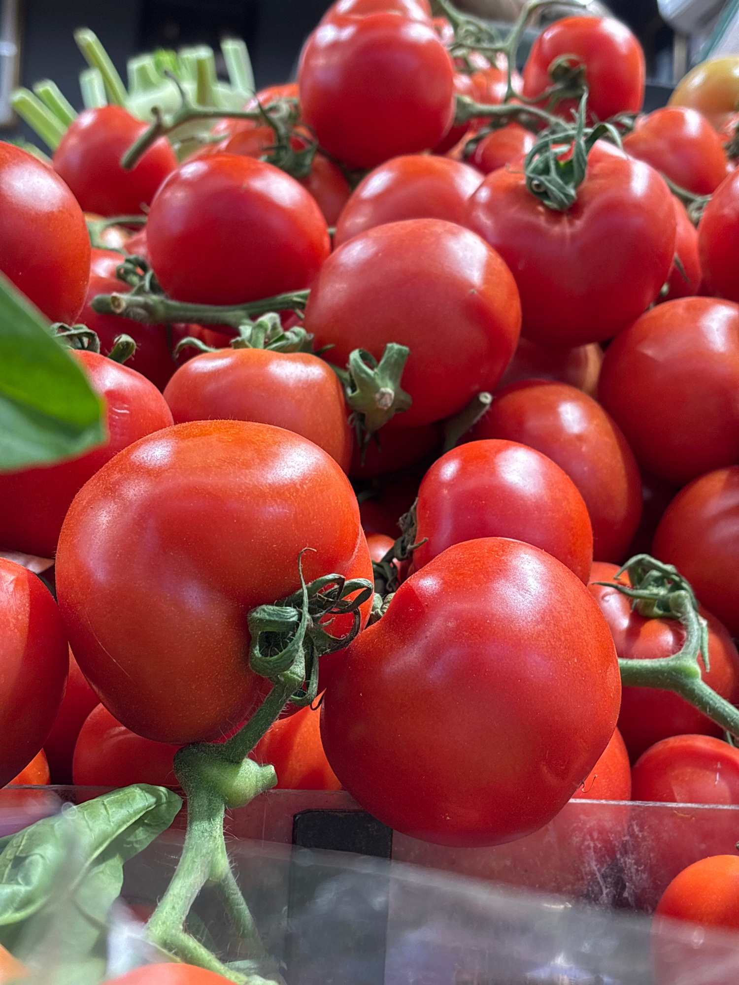 The image depicts a close-up of a cluster of red tomatoes on their vine. The tomatoes are densely packed together, varying slightly in size and shape. The green stems and leaves of the vines are visib…read more