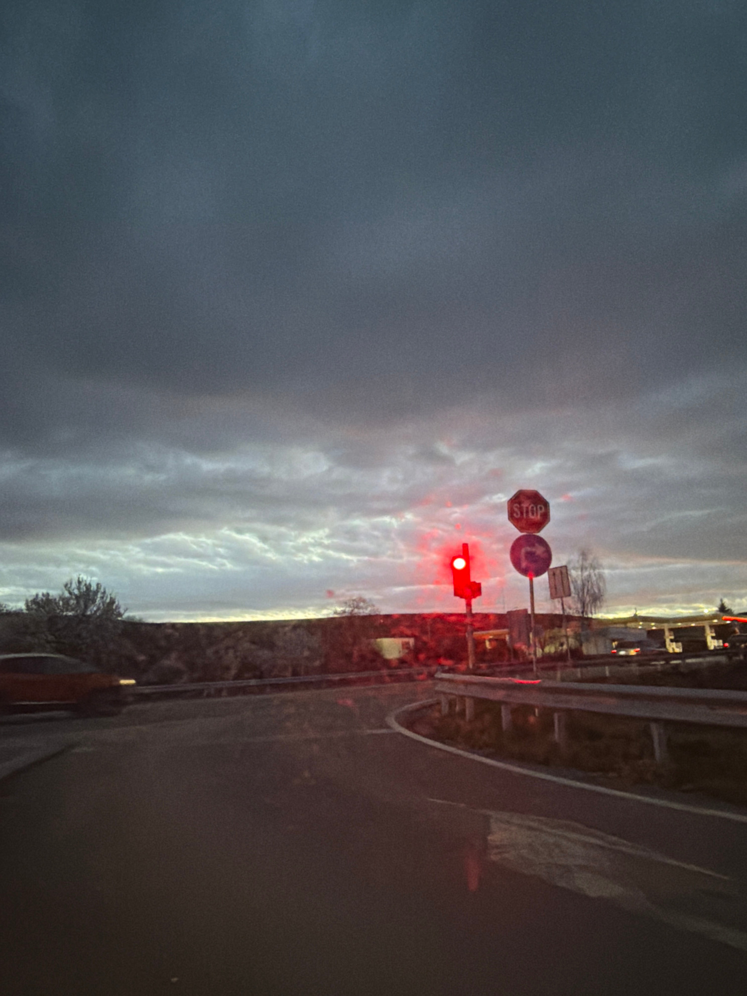 The image shows a road scene in Dragichevo, Bulgaria. The view is oriented vertically. A red traffic light is illuminated, situated near a stop sign and a blue circular sign. A road edge is visible on…read more