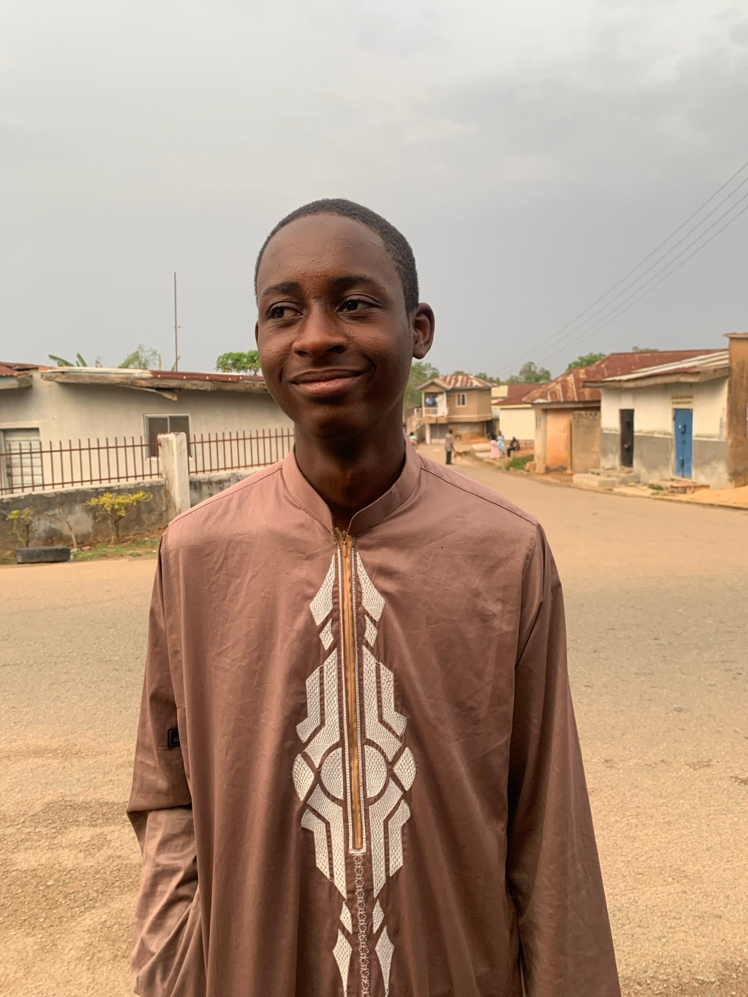 A young man smiles at the camera while standing on a street in Jos, Nigeria. He wears a brown tunic with white geometric embroidery around the neckline. The street is paved and runs between buildings…read more