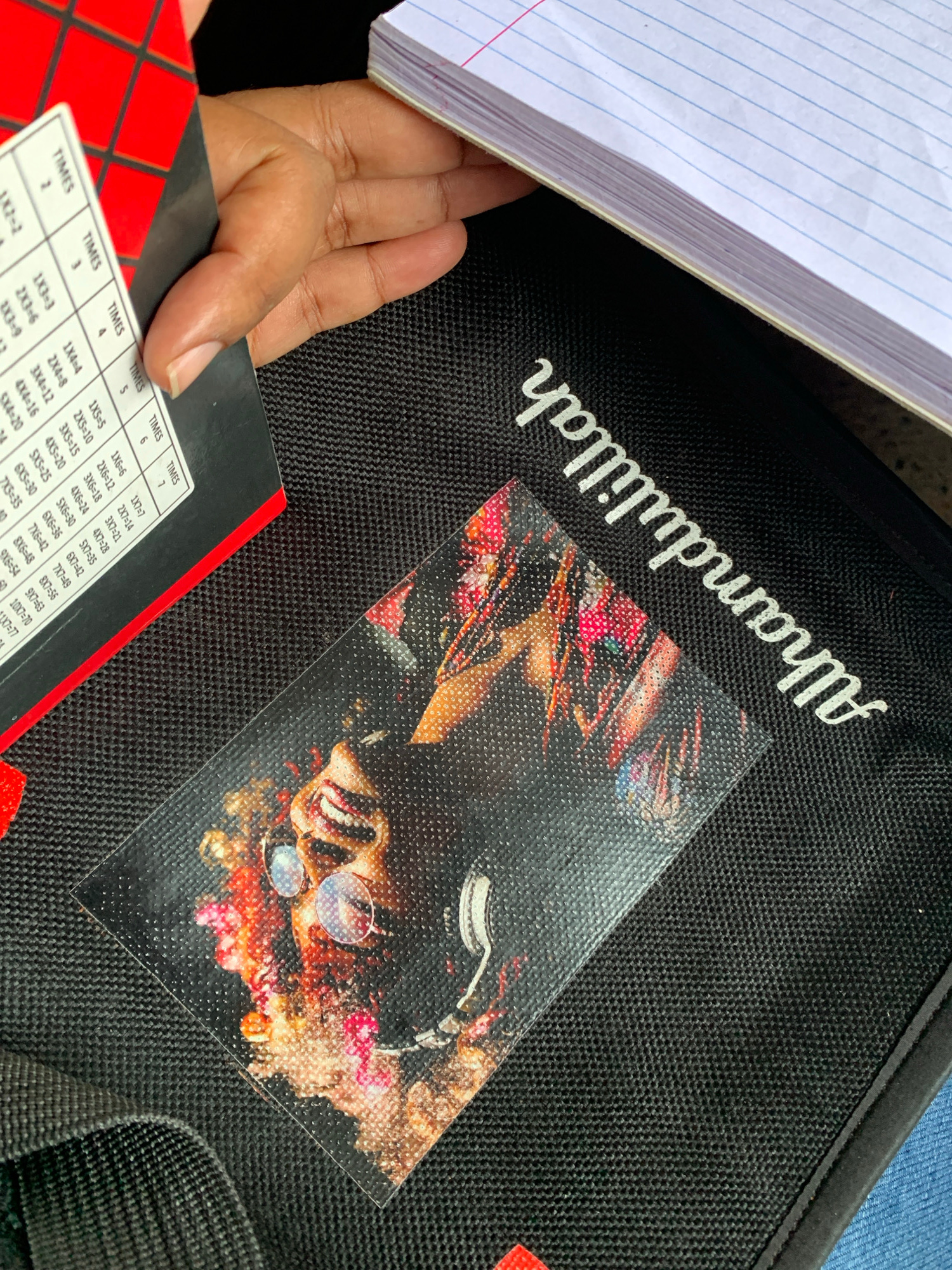 A person's hand is holding an open notebook and a multiplication table, resting on a black zippered binder. "Alhamdulillah" is printed in white script on the binder. There is a clear sticker featuring…read more