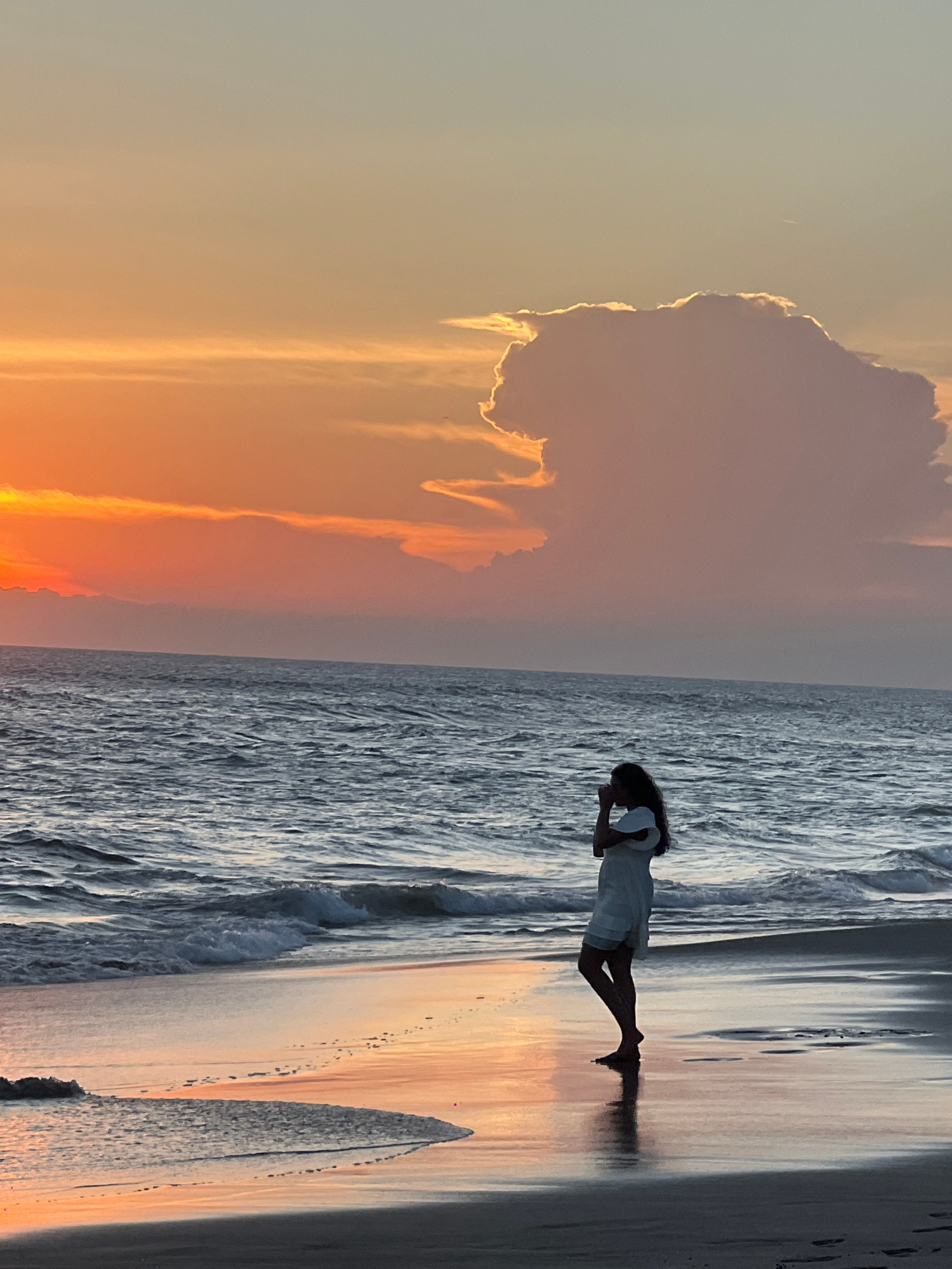 The image shows a beach scene at sunset in what is likely North Kuta, Indonesia. A person stands on the wet sand, facing towards the ocean. The sky is filled with orange and yellow hues from the setti…read more