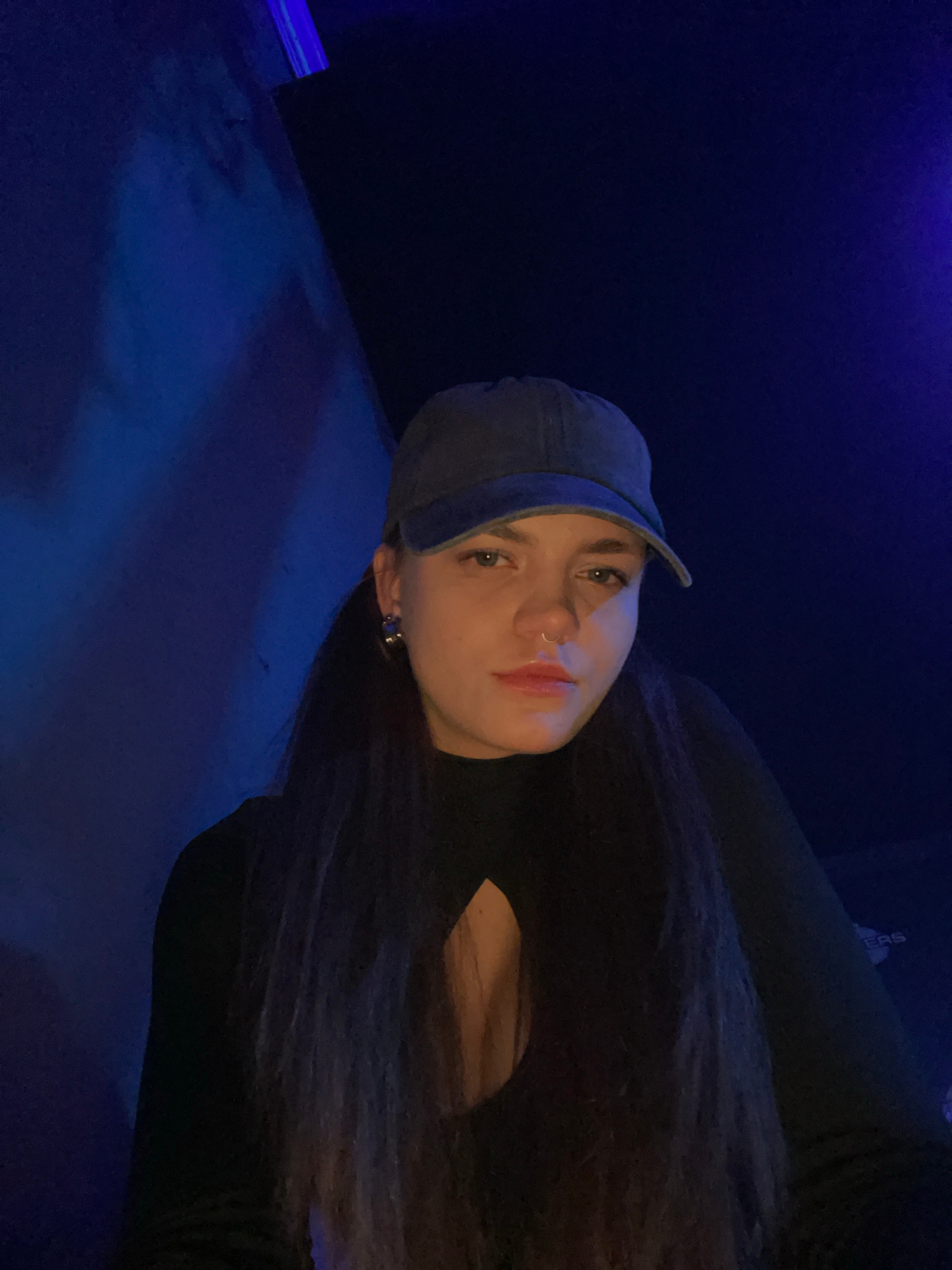 A young woman with long dark hair, blue eyes, and fair skin is depicted from the chest up, centered in a dimly lit, dark blue environment. She wears a dark blue baseball cap, a black long-sleeved top…read more