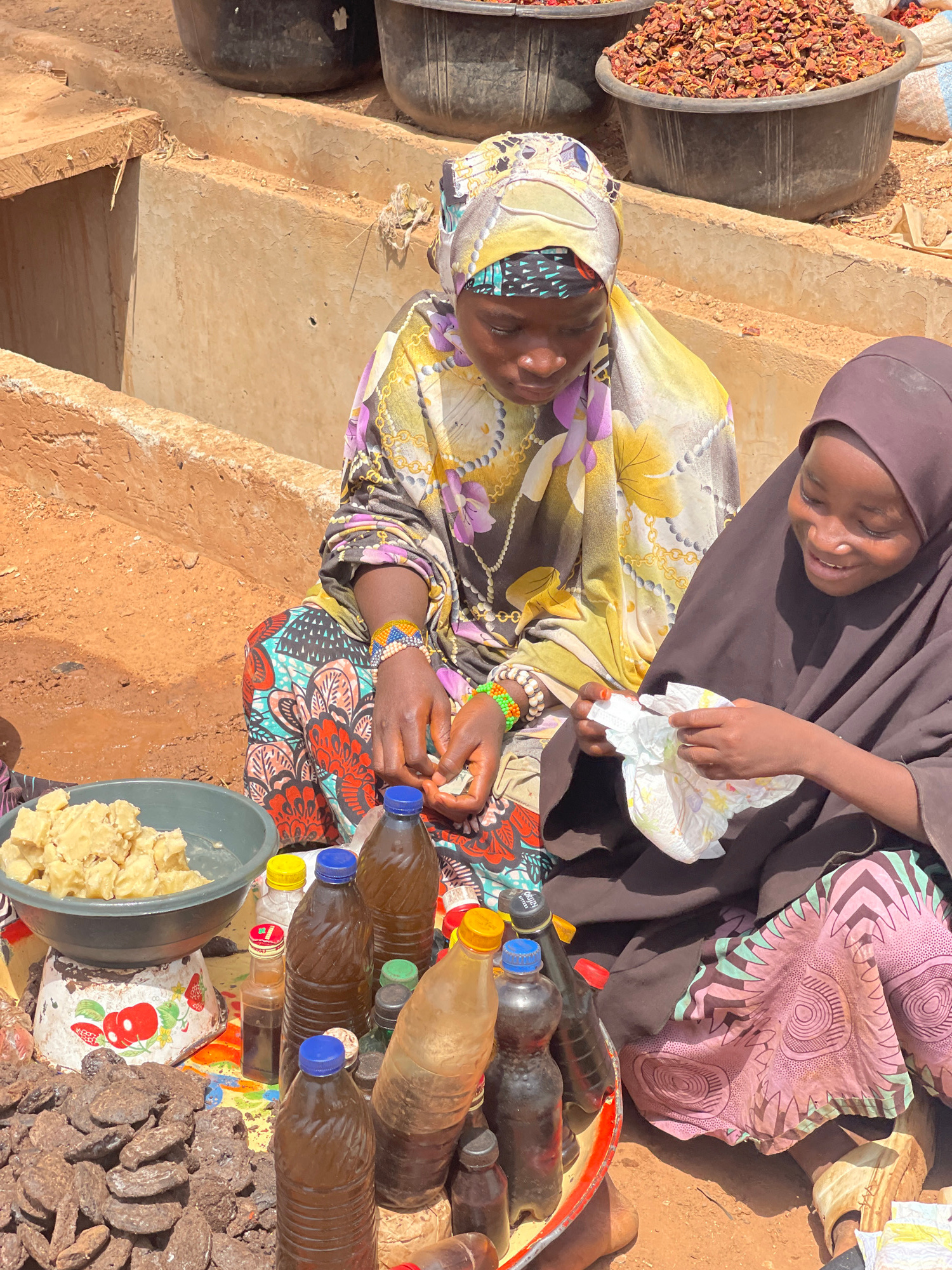Two females are seated on a weathered, earth-toned platform, likely at a marketplace in Zaria, Nigeria. The female on the left wears a floral-patterned yellow and purple headscarf and blouse over a co…read more
