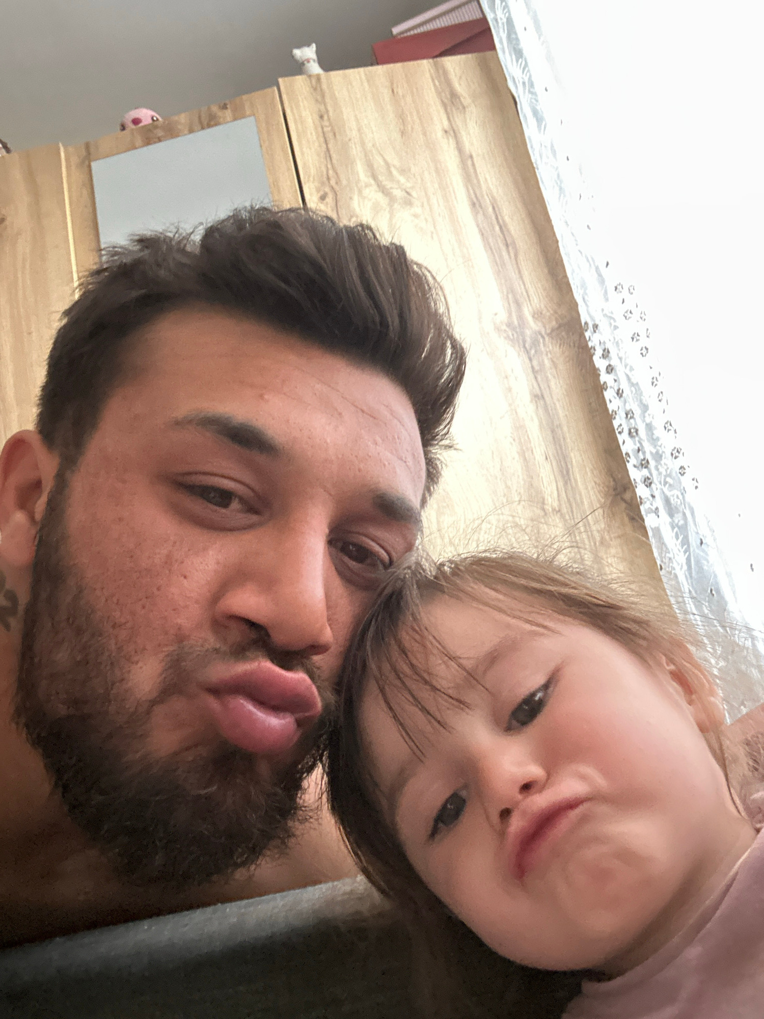 A man and a young child are posing closely for a selfie. The man has dark hair and a beard, and is making a "duck face" expression. The child, who appears to be a toddler, is also making a similar exp…read more