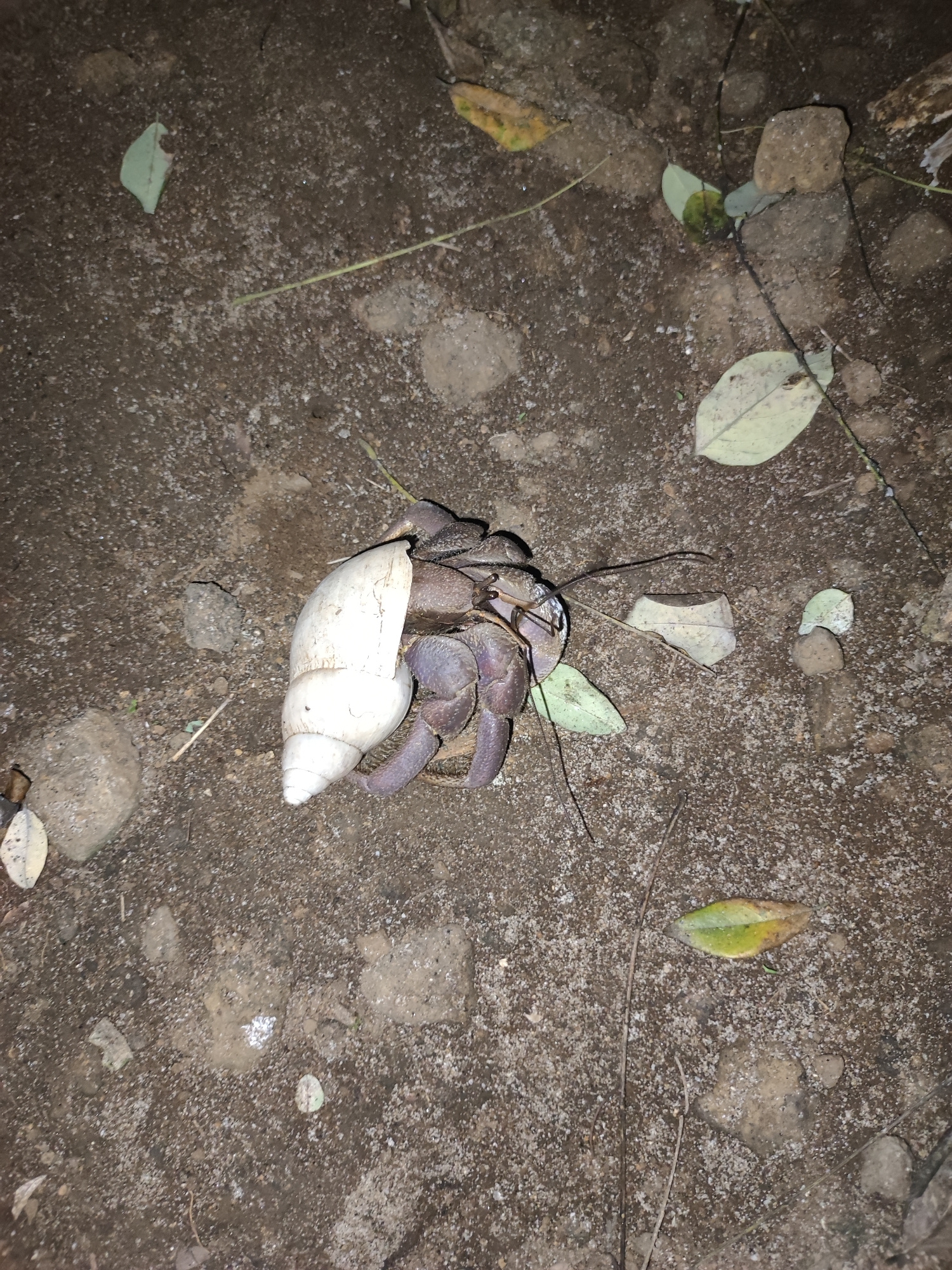 A land hermit crab occupies a white, spiral shell on a dirt ground in Padangbai, Indonesia. Small rocks, twigs, and leaves are scattered around the crab.