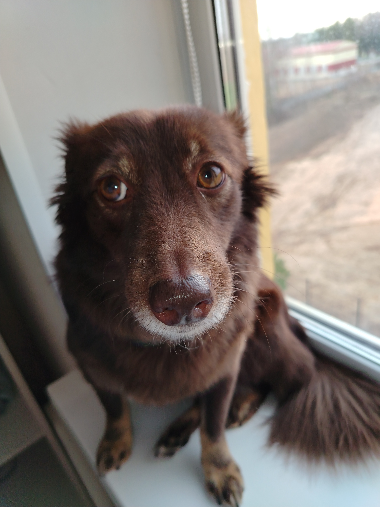 A medium-sized, long-haired brown dog is captured in a close-up, eye-level shot, sitting on a white windowsill. The dog has rich chocolate brown fur, with some lighter brown highlights visible aroundโฆread more