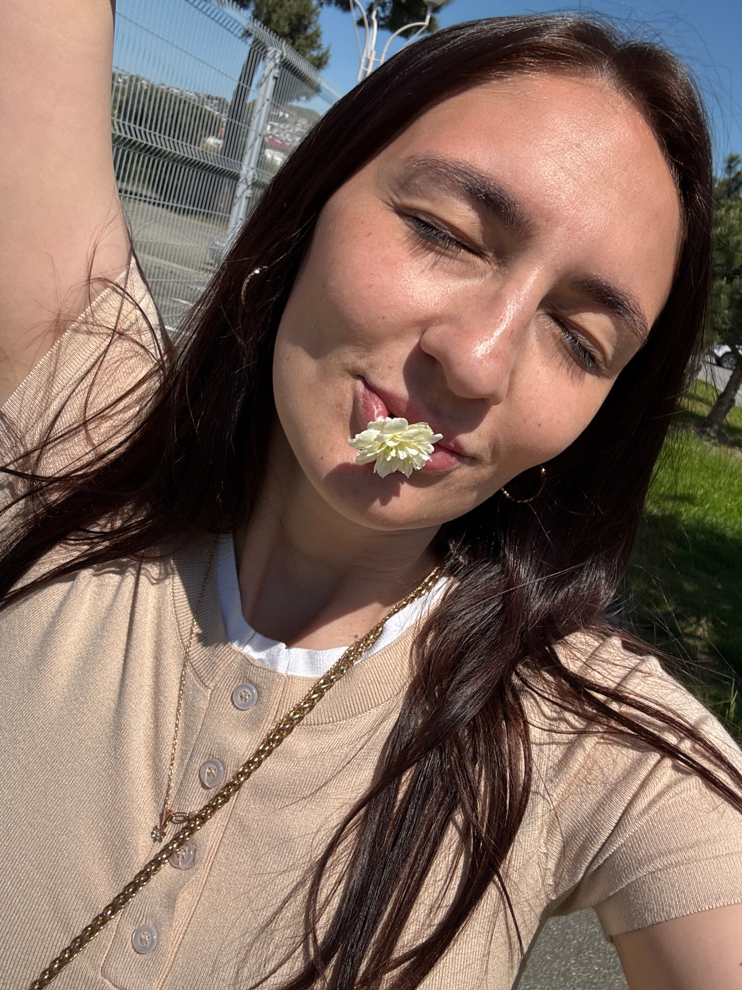 **Subjects:** The main subject is a young woman, captured in a close-up, tilted selfie. She has long, dark brown hair and clear skin. Her eyes are closed. **Objects:** A small, white or light yellow…read more