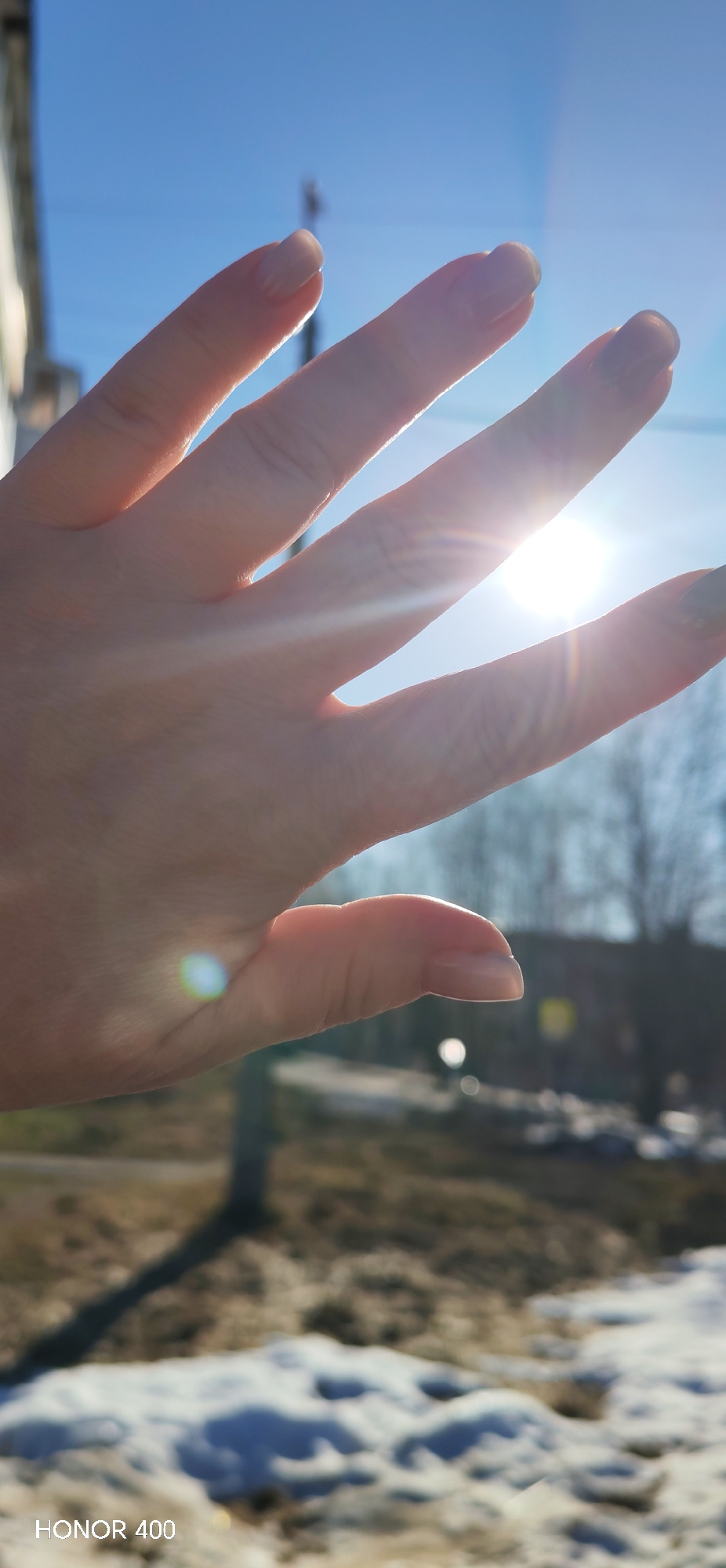 The image shows a person's hand held up towards a bright sun. The fingers are spread open, and the sunlight filters through them. The background is blurred, showing a landscape with patches of snow, s…read more