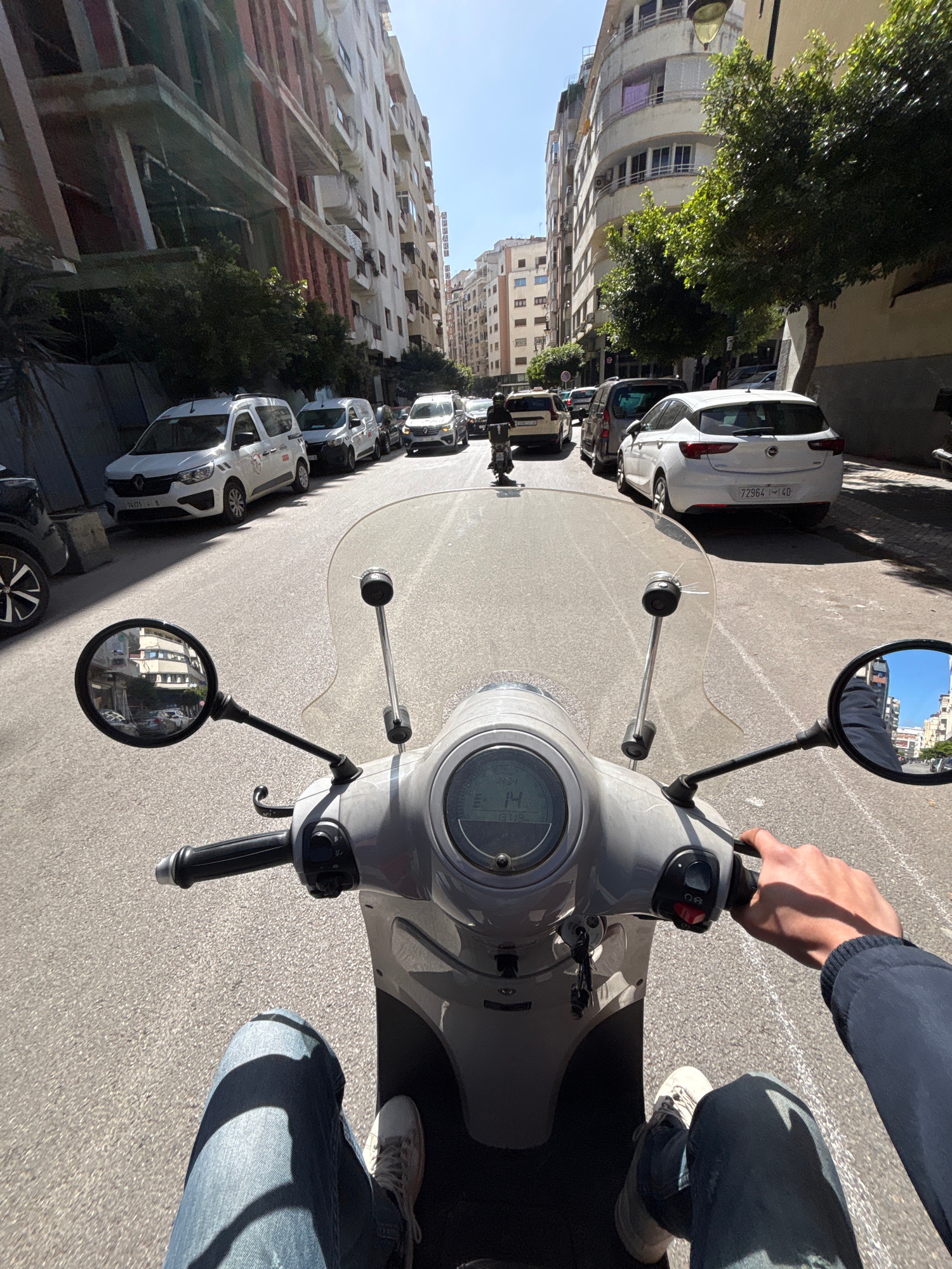 The image provides a first-person perspective from a light-grey scooter on an asphalt street in Tanger, Morocco, under bright daylight with a clear blue sky. The scooter's transparent windshield, both…read more