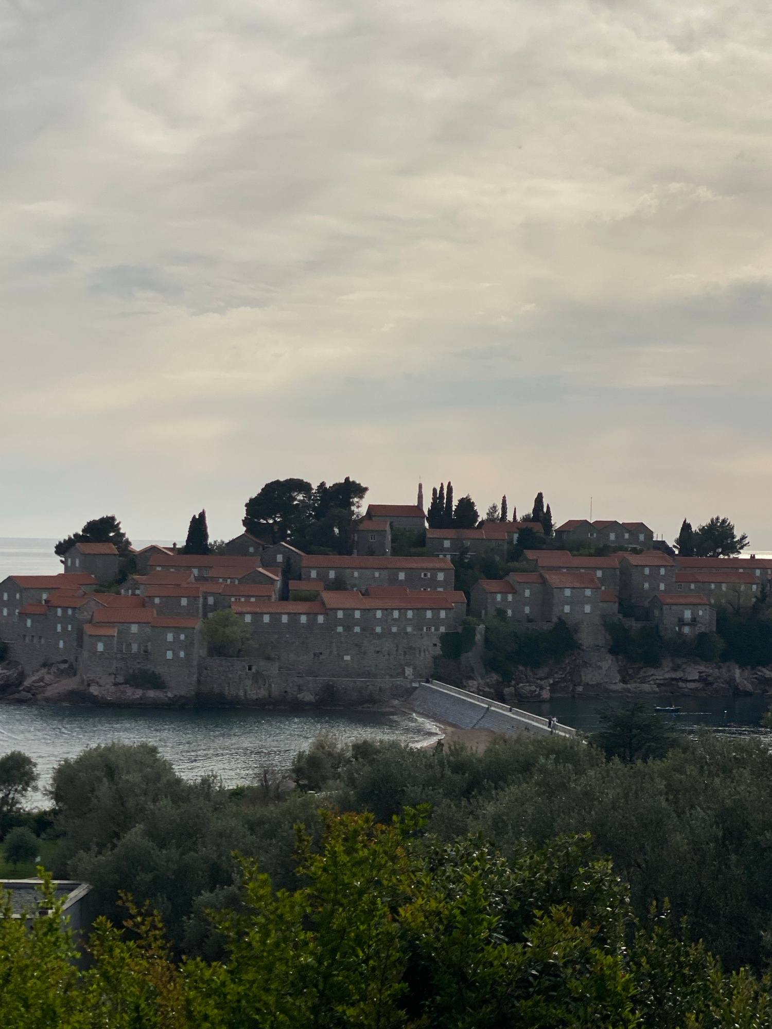 The image depicts Sveti Stefan, Montenegro, a small islet connected to the mainland by a narrow isthmus. Buildings with red-tiled roofs and stone facades are densely packed on the island. The sky is o…read more
