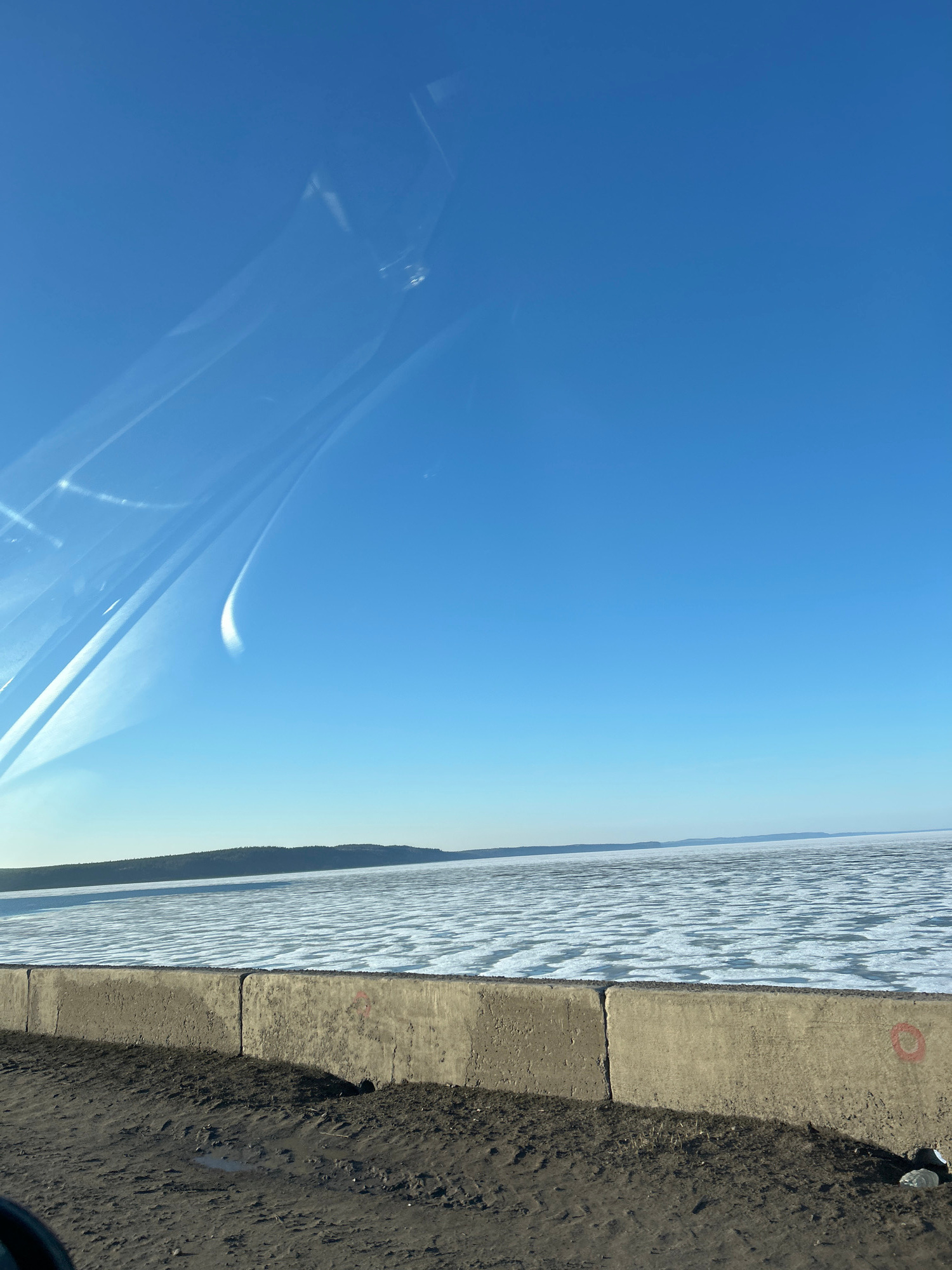 The image shows a landscape in Chaikovsky, Russia. On the right side of the frame, there is a concrete curb and dirt ground. Adjacent to that is a large, frozen body of water. In the distance, there i…read more