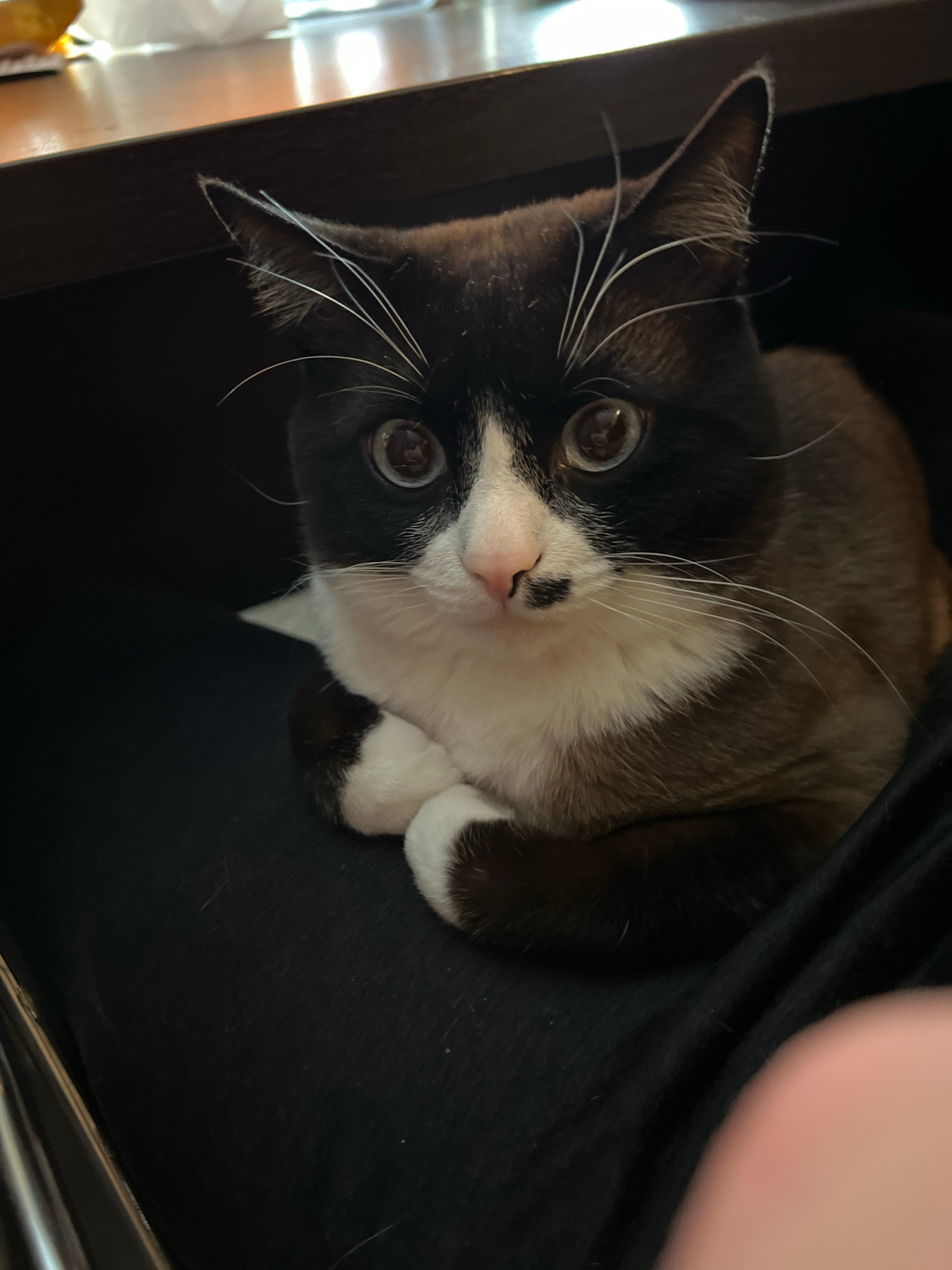 A cat with black and white fur is the main subject of the image. The cat has a predominantly black head with white fur around its mouth and chest. Its eyes are large and brown. The cat is looking direβ¦read more