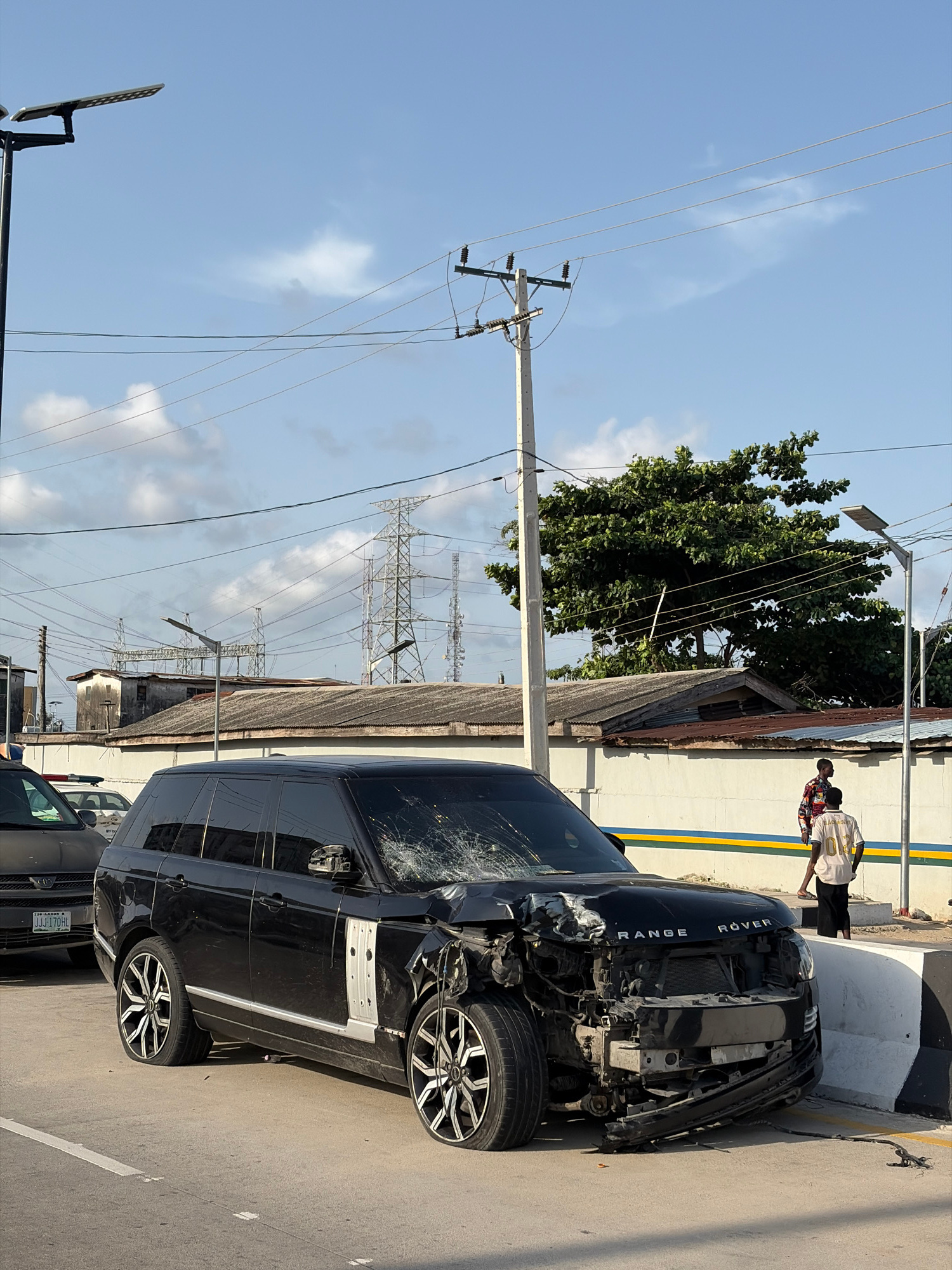 The image shows a damaged black Range Rover on a street in Igboefon, Nigeria. The front of the car is severely damaged, with missing parts and exposed internal components. The windshield is cracked. T…read more