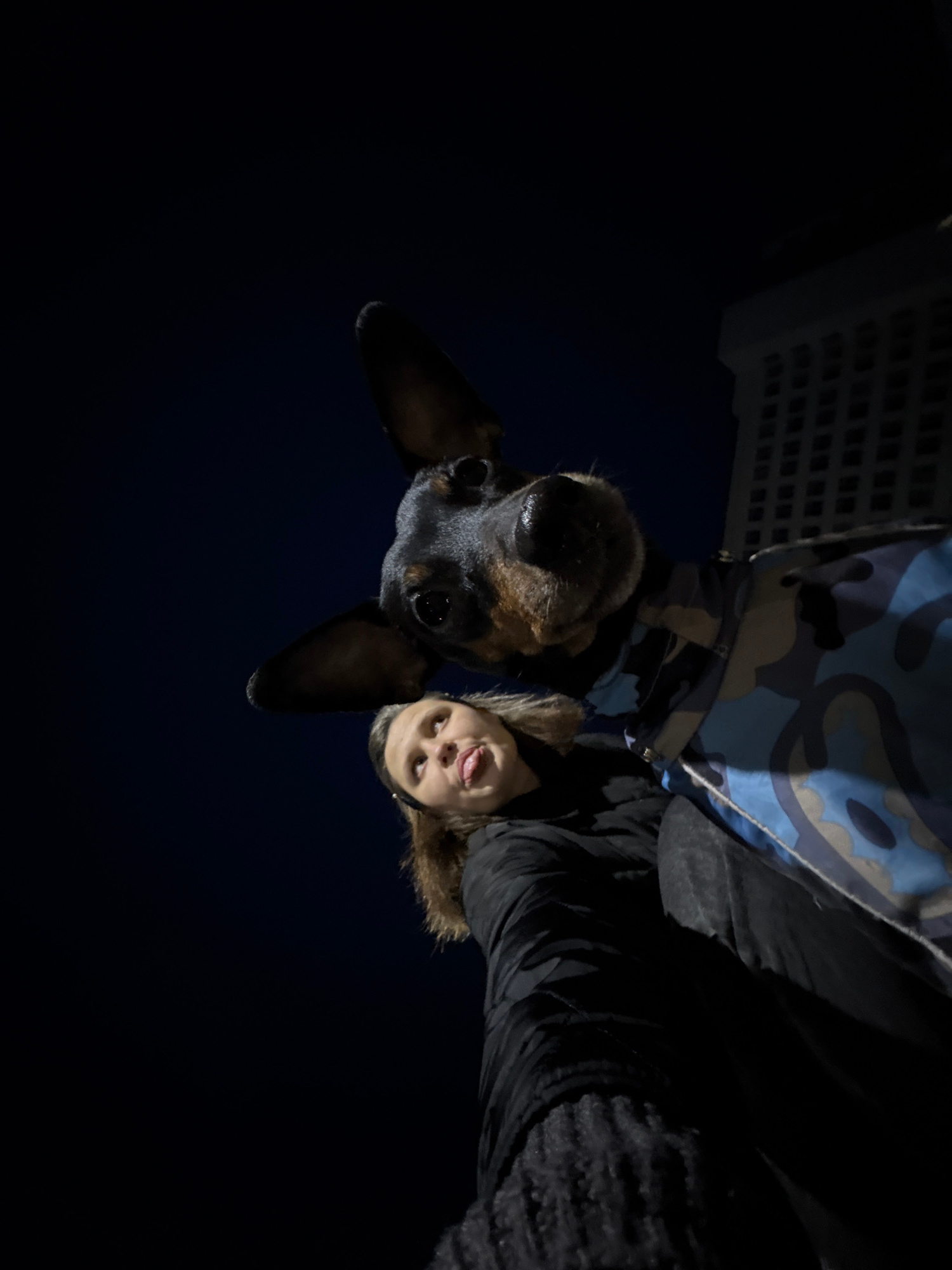 The photograph, taken from a low angle, shows a woman and a dachshund in an outdoor setting. The woman is wearing a dark-colored winter coat with a fur-trimmed hood. The dog is wearing a blue camoufla…read more