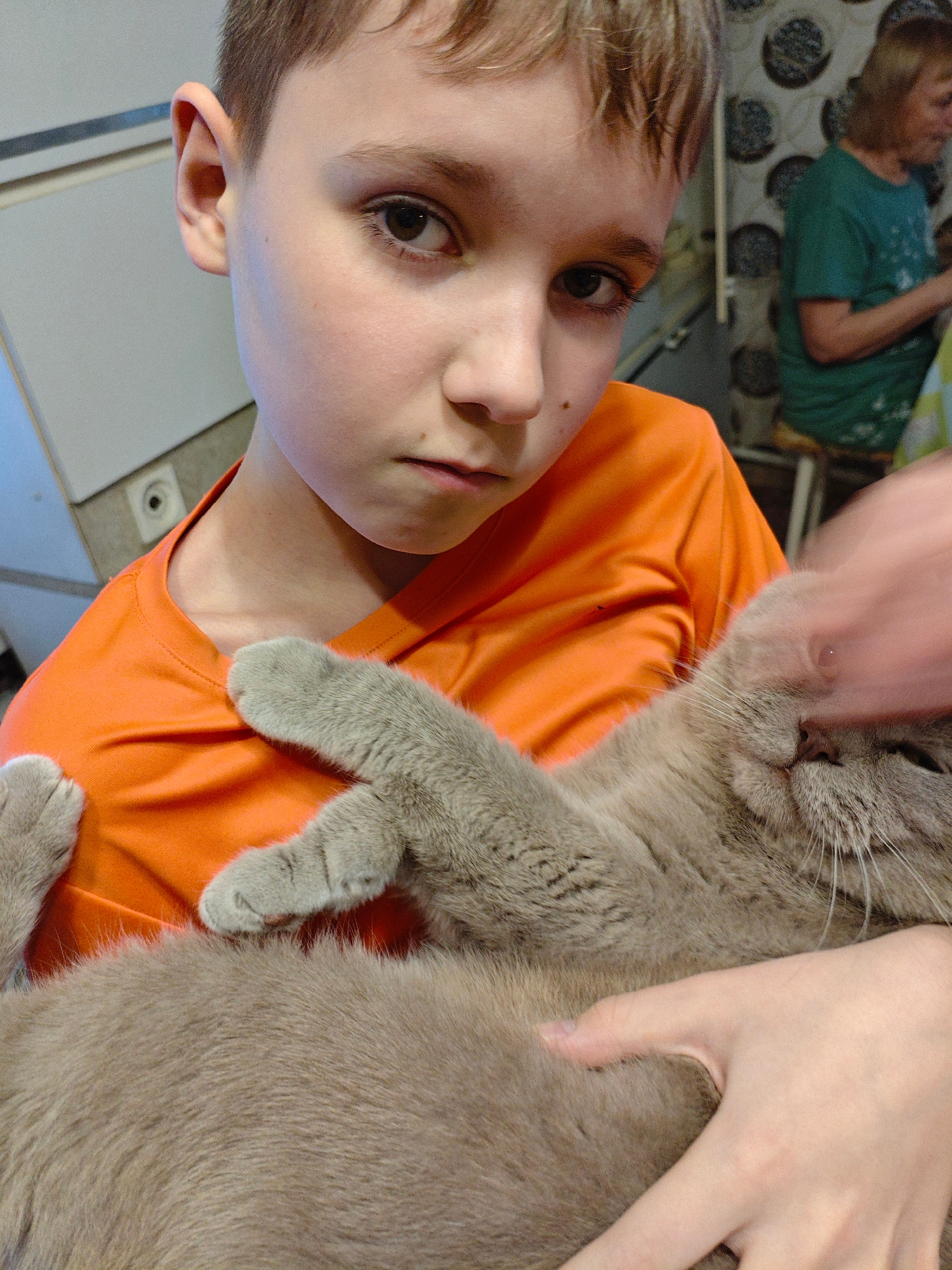 A medium indoor shot depicts a young boy holding a gray cat. The boy, wearing an orange t-shirt, gazes at the camera. The cat is being petted by a hand. In the background, an older woman in a green t-…read more